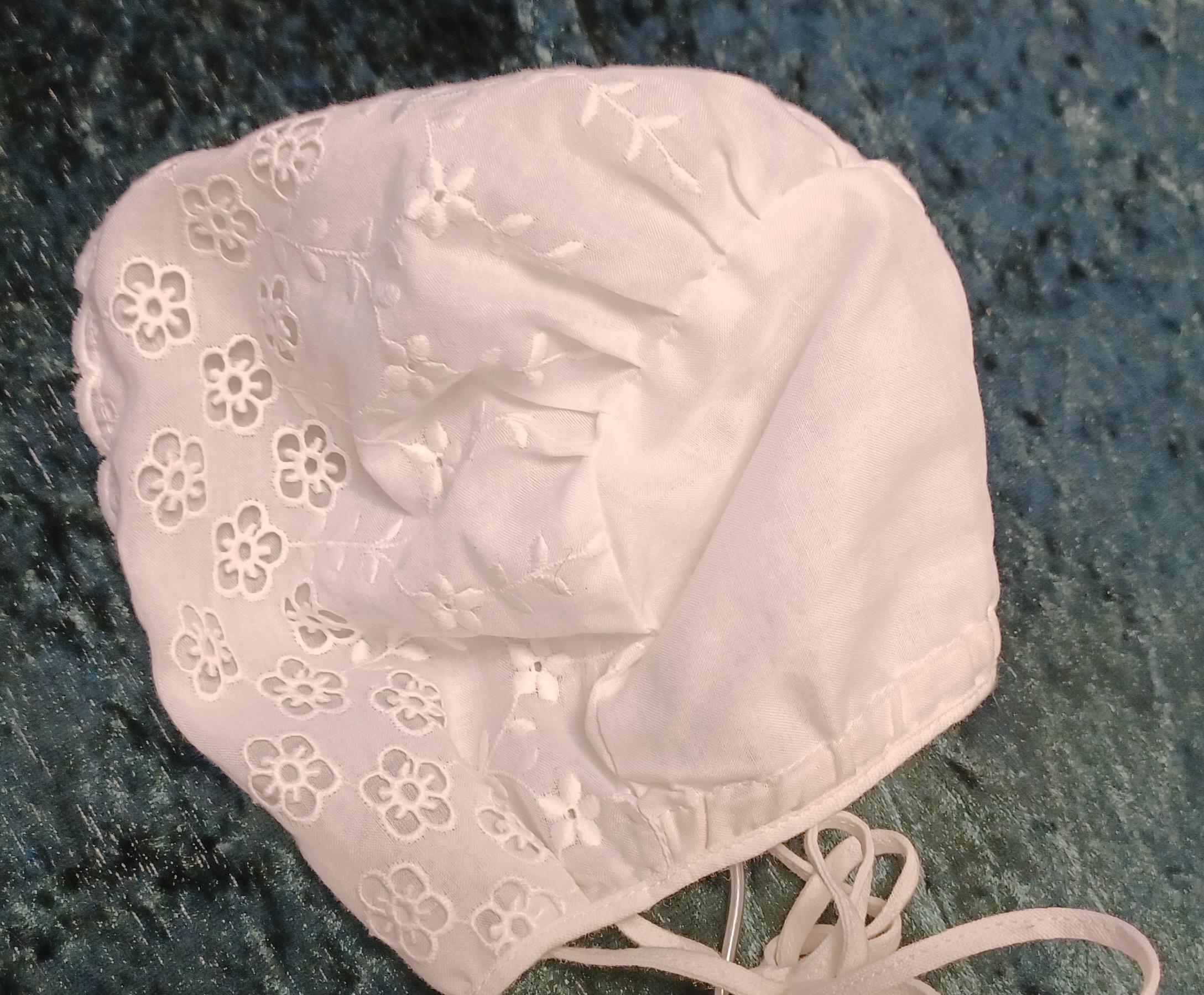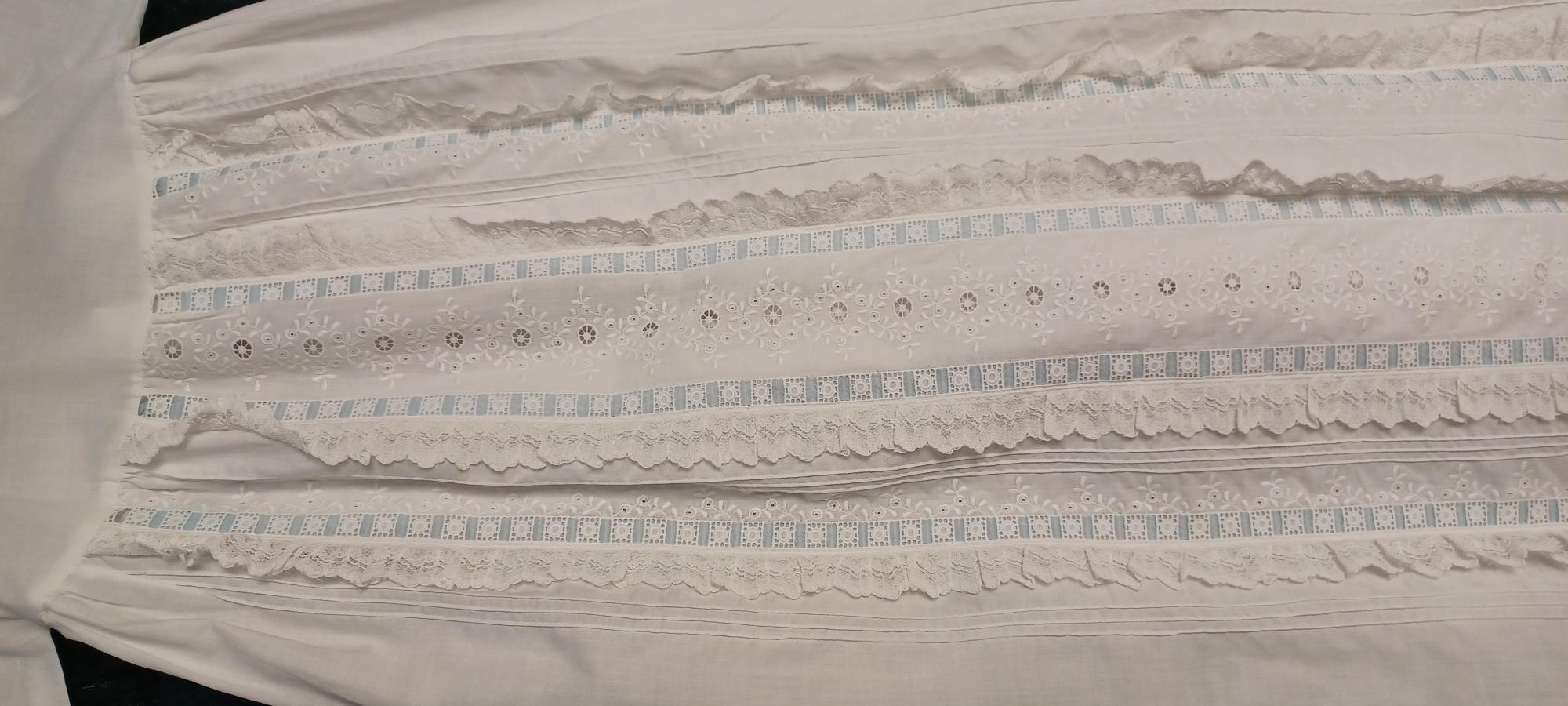 Kjolene passer for barn opp til fire måneder. Under her ser du bilde av dåpskjolen som er tredd med lyseblå bånd og som ikke har tilhørende lue. Hovedbildet øverst i denne saken viser kjolen med lue som er helt hvit.