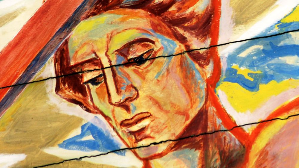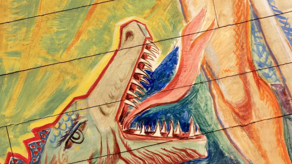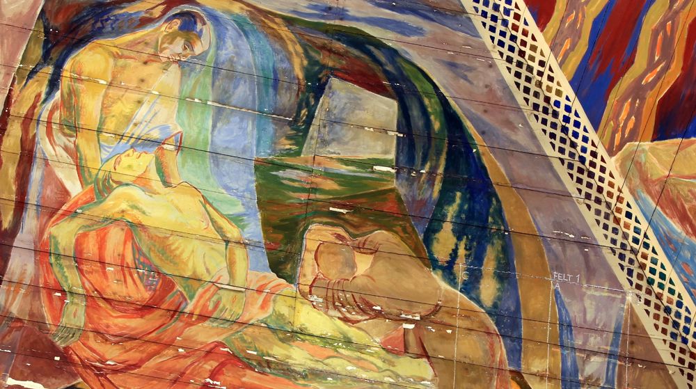 • “Crucified” depicts the descent from the cross. To the right stands John. Mary, Jesus’ mother, kneels at the foot of the cross.