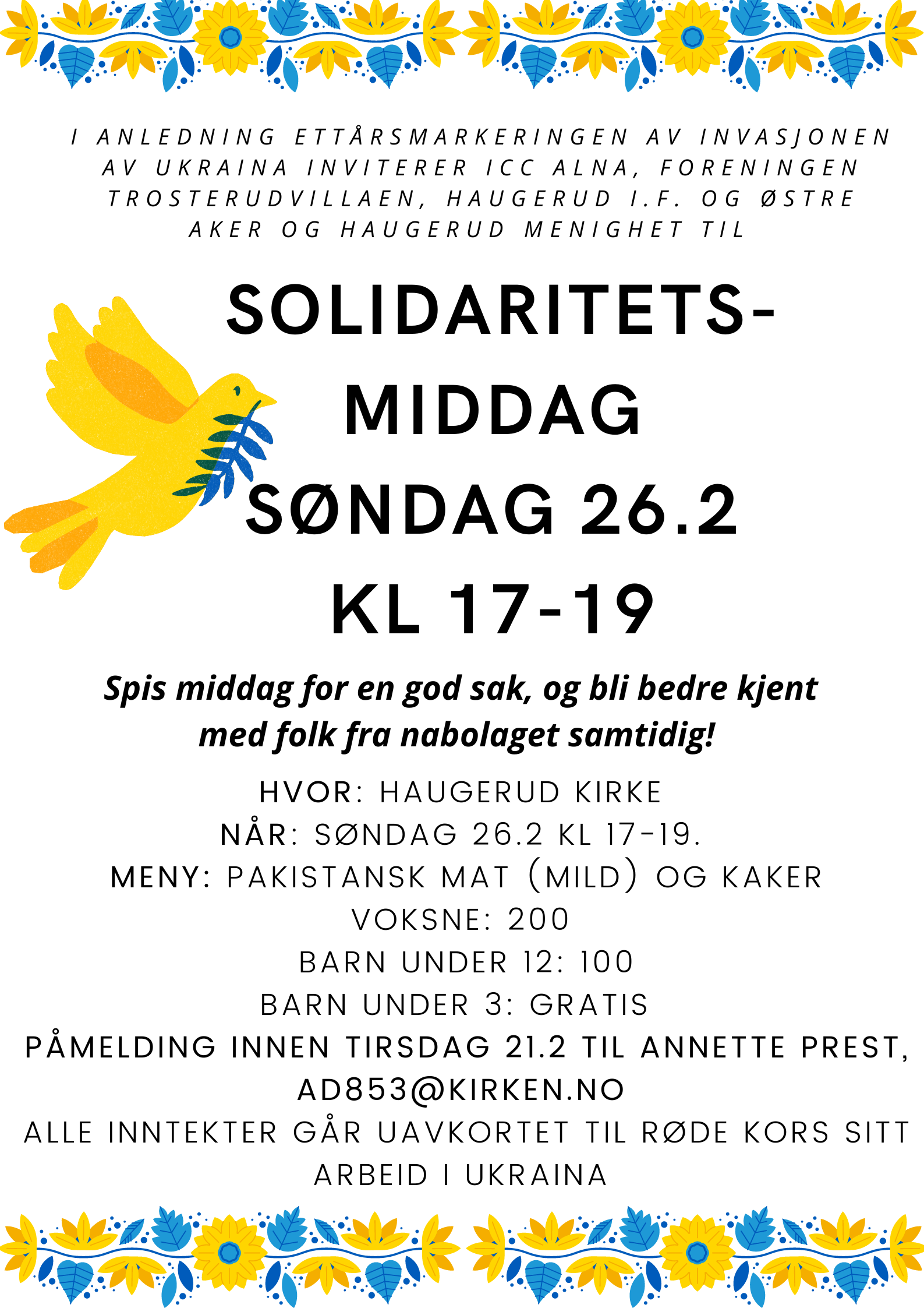 16.2.2023Søndag 26. februar blir det solidaritetsmiddag for Ukraina i Haugerud kirke klokka 17-19.