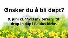 6.5.2025Ønsker du å bli døpt? 9. juni kl 11-13 inviterer vi til drop-in dåp i Paulus kirke.