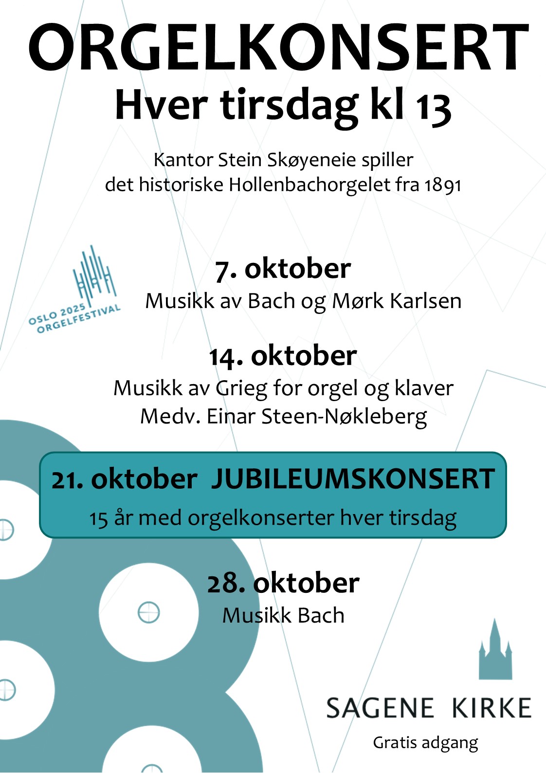 21. oktober blir det jubileumskonsert. Men hva er jubileet? Historien til Sagene kirke har seg slik at 1. søndag i advent 2005 stengte kirkevergen kirken fordi det ble funnet hussopp i takkonstruksjonen. Da startet rehabiliteringsklokka med mye trøbbel underveis. Ja, hele fem år tok det før kirken kunne gjenåpnes. Den store åpningsdagen ble søndag 10. oktober 2010. 10. 10. 10 kl. 10. En hel ukes åpningsfest ble det. Og den ble kronet med en orgelkonsert søndag 17. 10. Etter fem år i taushet var dronningen av Sagene igjen et klingende fenomen. Vi som arbeidet i kirken tok ini10a10v 10l at fra nå av skal kirken være åpen, så mye som mulig. Og det ble fra kl. 12-20 fire dager i uka. «10ing skal skje», var mottoet. Allerede 19. 10 planla vi en ny orgelkonsert. Denne gangen kl. 13 og på en 10rsdag. Siden har det blitt mange tirsdagskonserter. Ja, jeg har fak10sk spilt en orgelkonsert hver eneste 10rsdag siden da og fram 10l nå. Med unntak årenes to sommermåneder. Da hviler mine 10 fingre. For den som er kjapp i hoderegning; 19.10.2010 …. 21.10.2025 …. Ja, det blir nesten på dagen …. 15 år. Akkurat som en våryr 10. klassing. Og slik blir nok også min 15-års jubileumskonsert for tirsdagskonsertene på Sagene. Ca. 660 konserter 10pper jeg det har blitt i årenes løp. Pr i dag har jeg ikke helt landet hva jeg skal spille denne formiddagen, 10den vil vise. Jeg har jo antydet noe i denne teksten. Og, det kan fort bli «Ti i skuddet» fra mitt hjerte. BARE KOM. Det blir fæst i kjærka. For; Ti amo, Hollenbach organo! (bildet: kirkeplassen idet kirken åpner dørene 10.10.10. kl. 10)