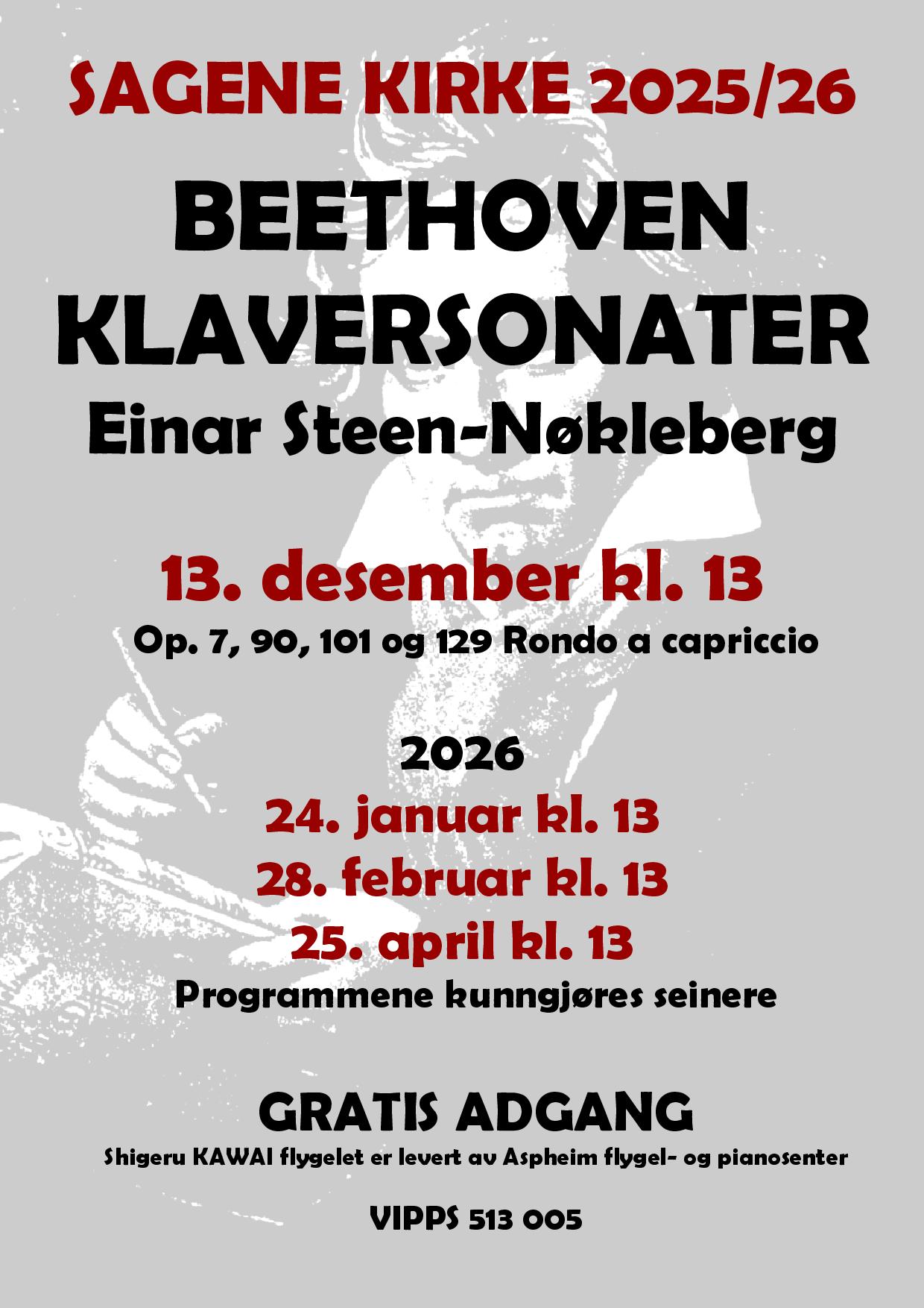 Mesterpianisten professor Einar Steen-Nøkleberg har levd et langt liv som utøver og pedagog. De fleste store mesterverk har han framført ved utallige konserter verden over. Han har undervist studenter på det høyeste nivå ved Musikkhøgskolen i Oslo og i Hannover. Og svært mye musikk har han også spilt inn på plate/CD. Steen-Nøkleberg har trofast støttet musikklivet i Sagene kirke i Oslo med mang en konsert. Han trollbinder sitt publikum – og kirkerommet – med sin sobre klangbehandling, dynamiske spill og utsøkte artikulasjon; en framførelseskunst fylt av stilrenhet og genuin personlighet. Og ikke minst med den fortolkningsmessige erfaring han har tilegnet seg gjennom en lang karriere.