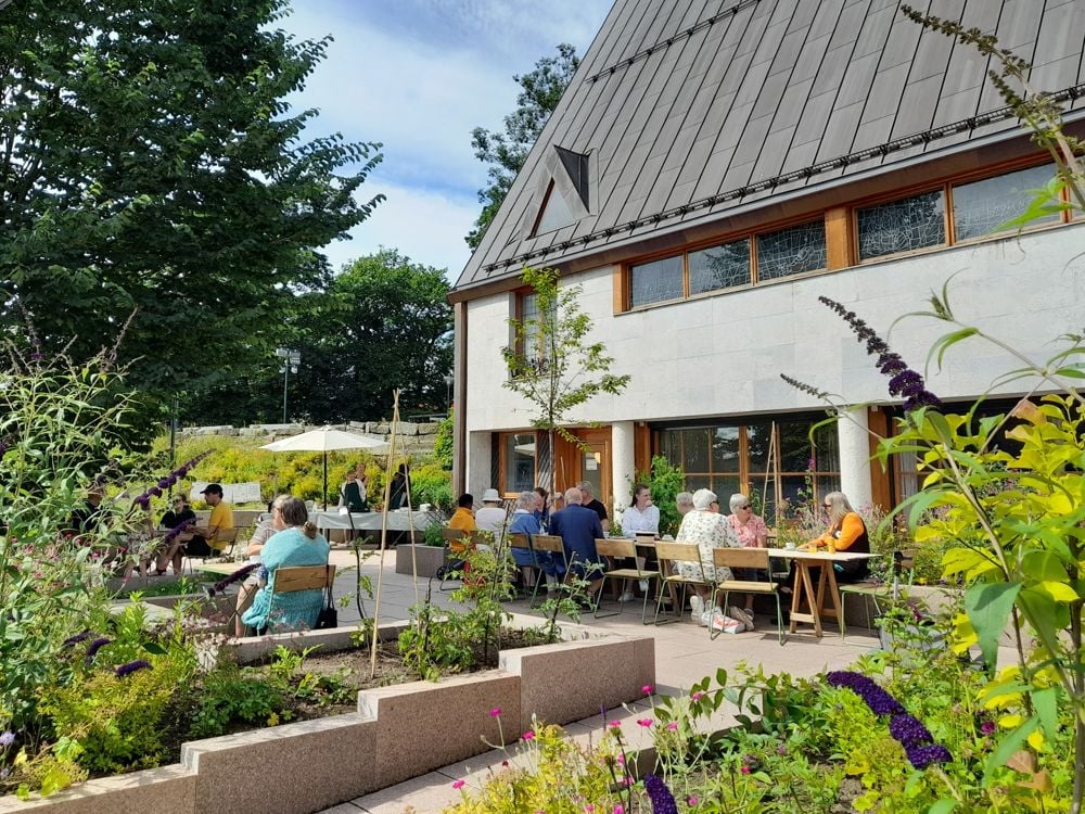 Sommerkaféen er et frodig og rimelig møtested for lokalsamfunnet, hvor folk i alle aldre kan møtes blant fargerike blomster og trær.