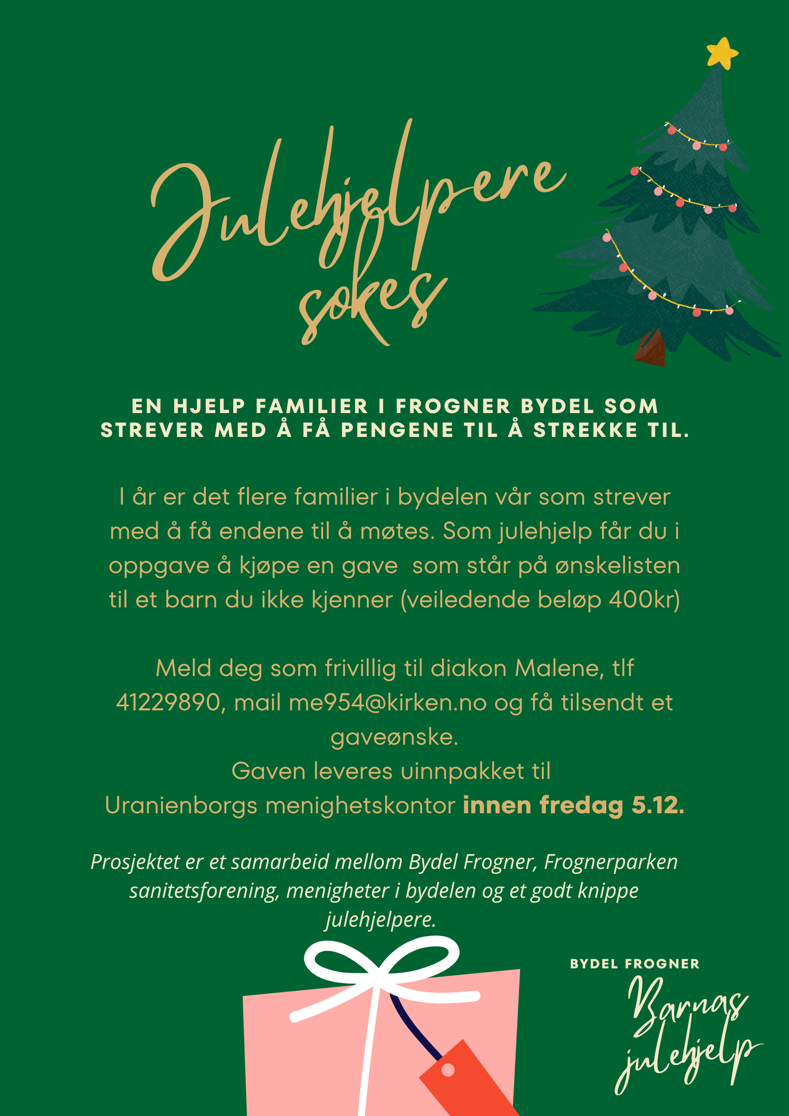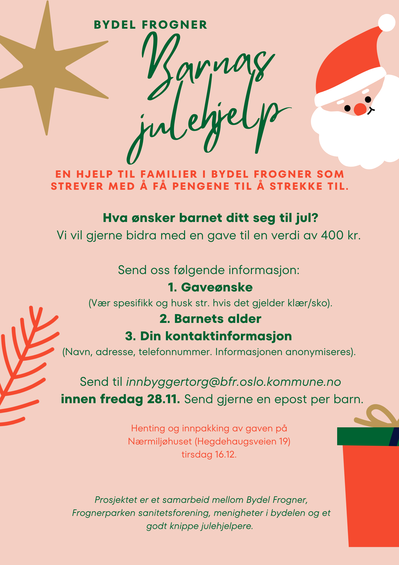 Prosjektet springer ut fra et konkret behov uttrykt av familier i vårt nærområde, der økonomiske forskjeller blir særlig tydelige i møte med høytider som julen. Sammen med NAV (innbyggertorget), Familiens Arena (tidl. Nærmiljøhuset), Frognerparken Sanitetsforening, Tidemannstuen, Fagerborg menighet, Evangelische Gemeinde deutscher Sprache in Norwegen, Kirken Håp har vi derfor utviklet en modell som er både bærekraftig og relasjonsbyggende – og som bygger på samskaping som arbeidsform.