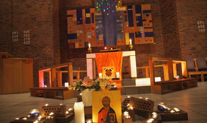 En søndag hvert semester inviterer vi til Taizémesse på kvelden. Taizémessene er meditative og er preget av ro og stillhet og sakte tempo.