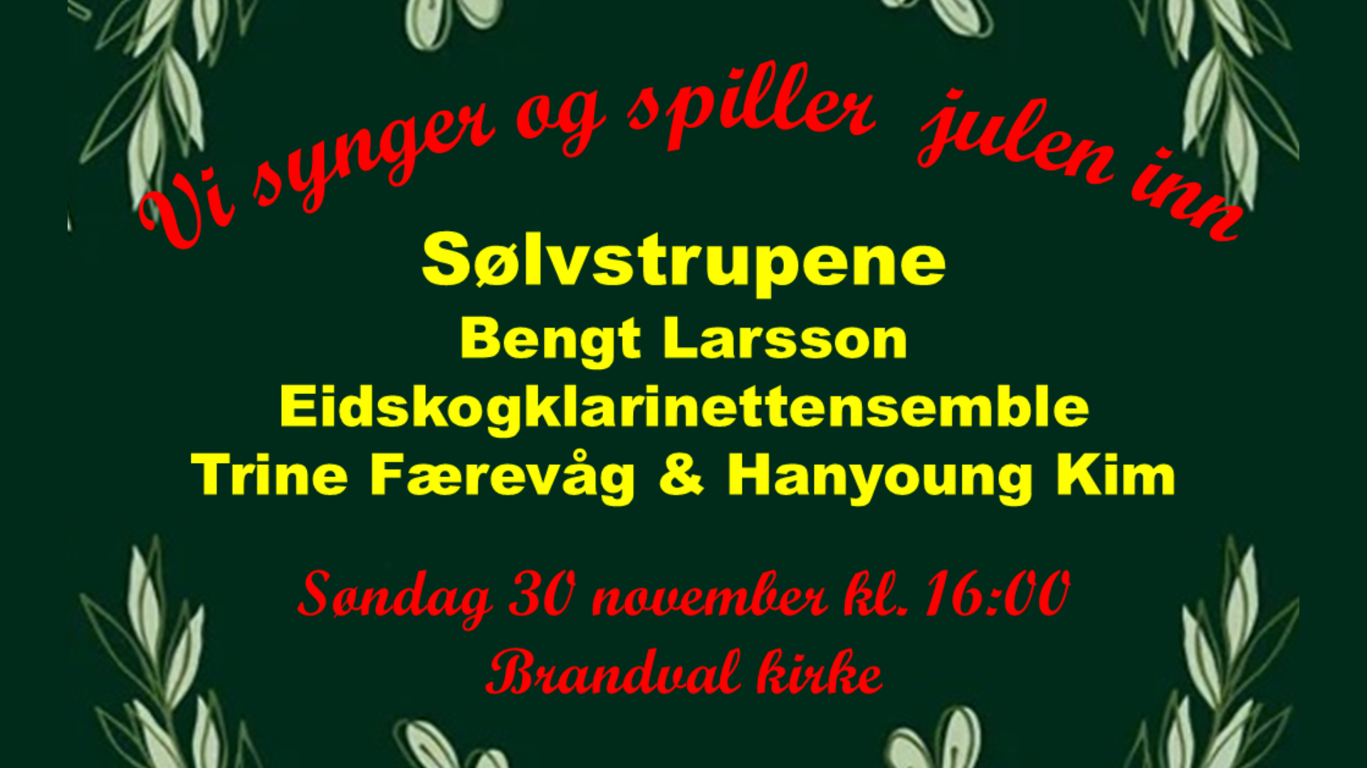 5.12.2025Konserten i Vinger kirke, søndag 14. desember kl. 14:00, er dessverre avlyst grunnet sykdom.