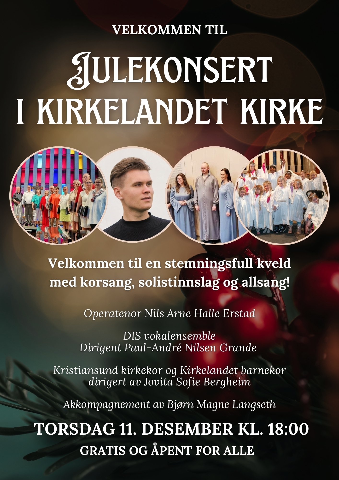 Torsdag 11. desember kl. 18:00 blir det Julekonsert i Kirkelandet kirke