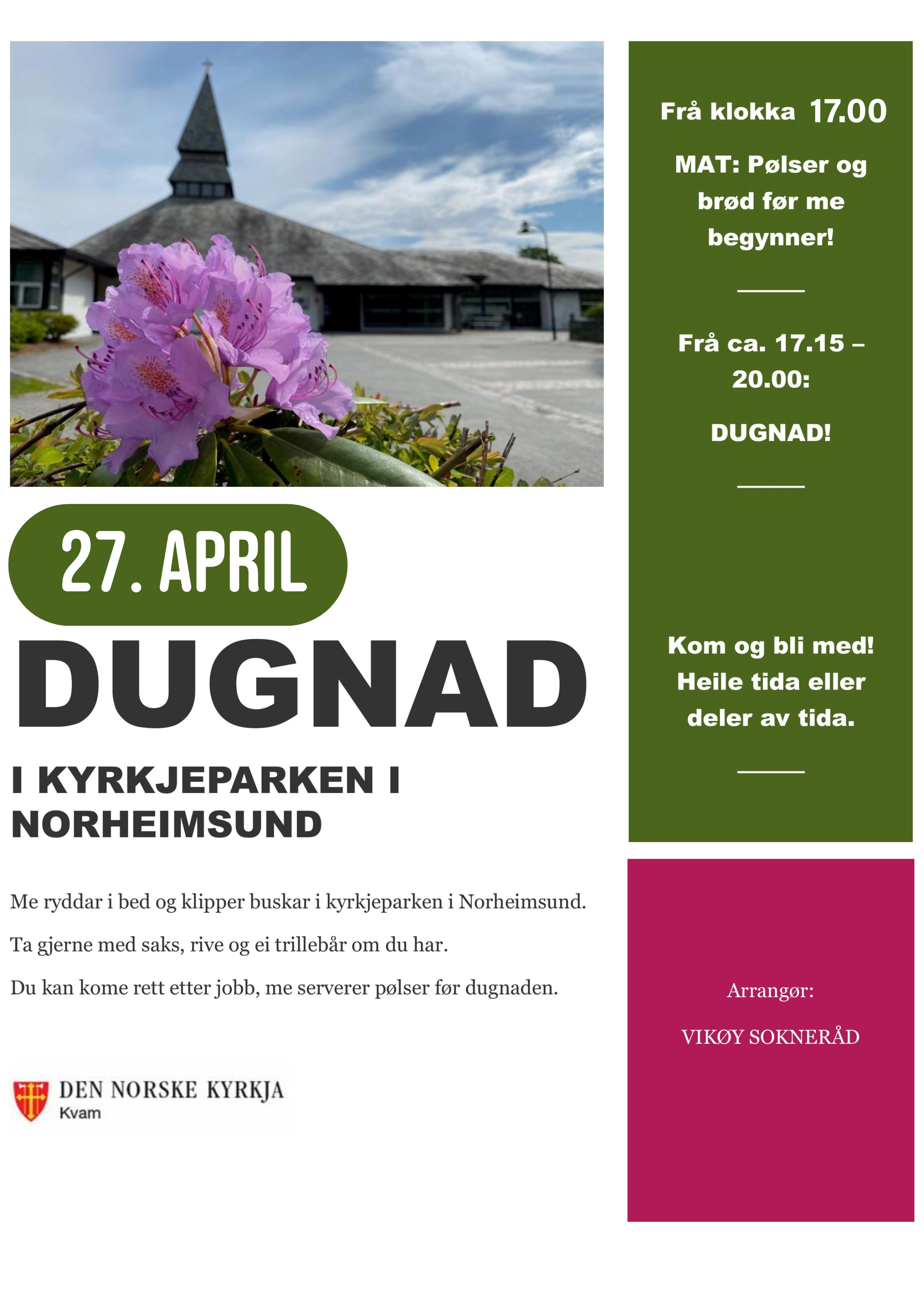 Du kan gjerne kome rett frå jobb, me serverer pølse før dugnaden. Eller når det måtte passa deg mellom 17.00 og 20.00.