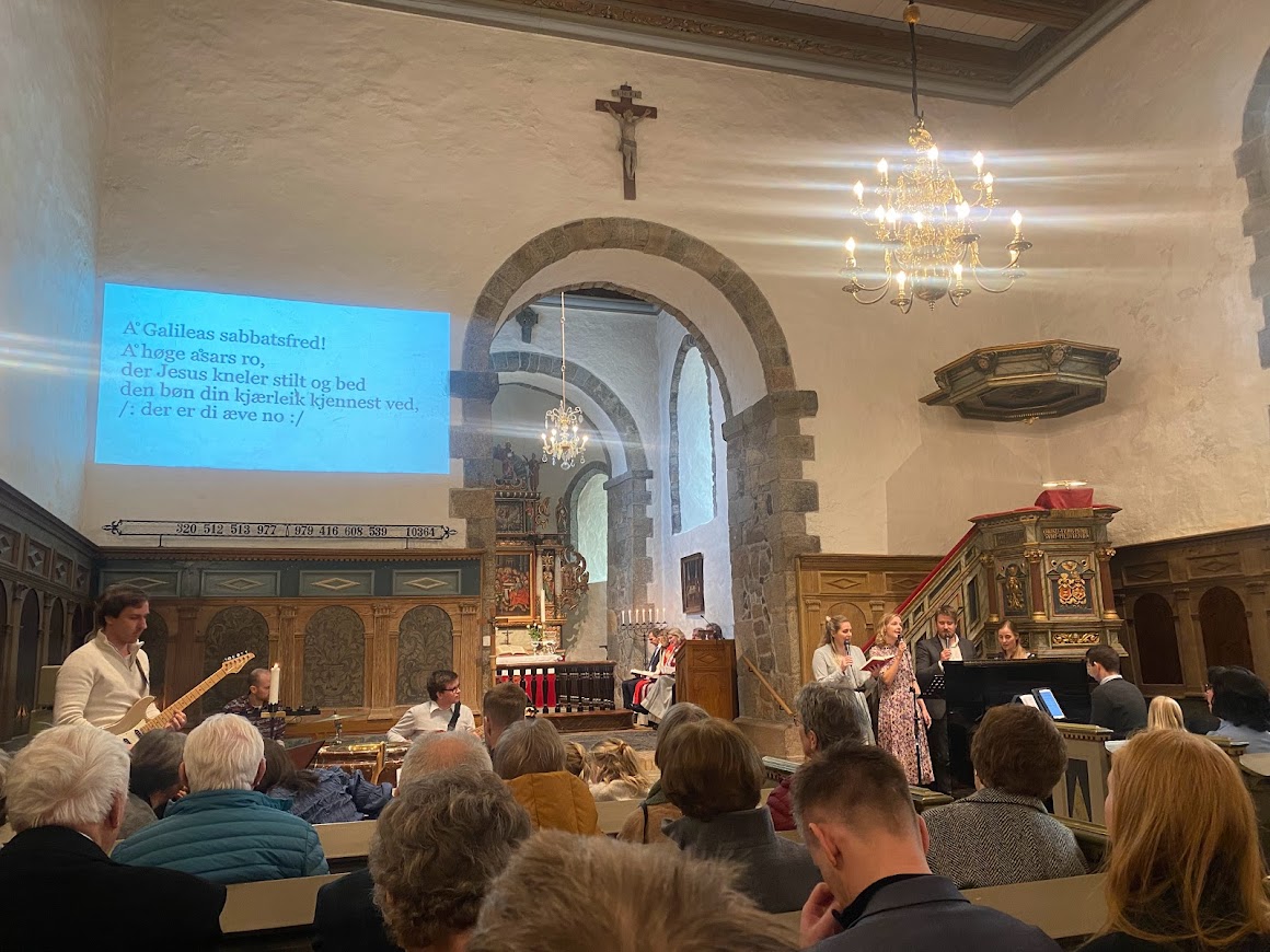 Det var Benedicte som holdt søndagens preken. Prekenteksten var fra Johannesevangeliet, kapittel 14. Kapittelet begynner med Jesu ord: «La ikke hjertet bli grepet av angst. Tro på Gud og tro på meg!» Benedicte la ikke skjul på at hun har opplevd mye angst, og sa samtidig at det er noe alle kan kjenne på, i mindre eller større grad.