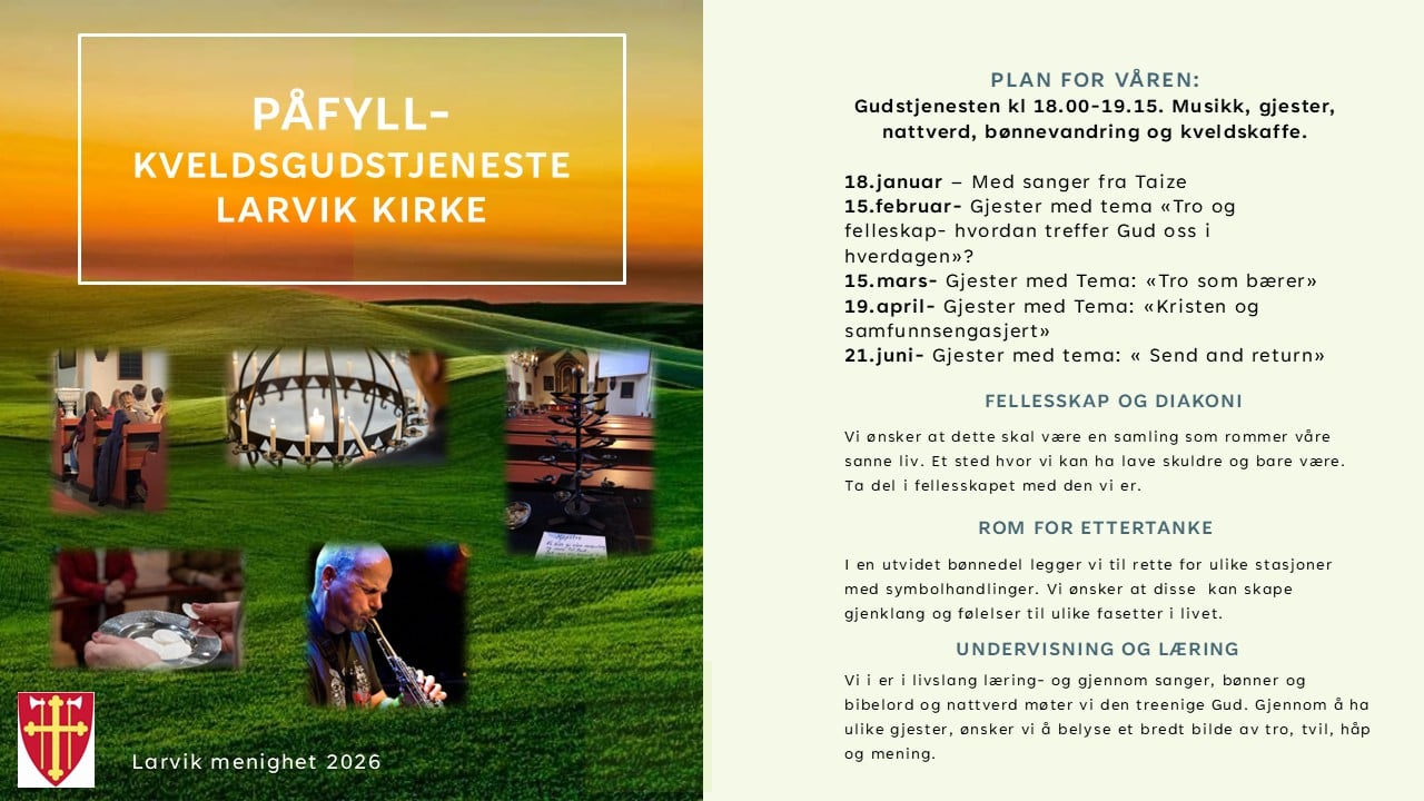 Oversikt over gudstjenester i sentrumsmenighetene Larvik, Langestrand og Nanset kirke vinteren 2026.