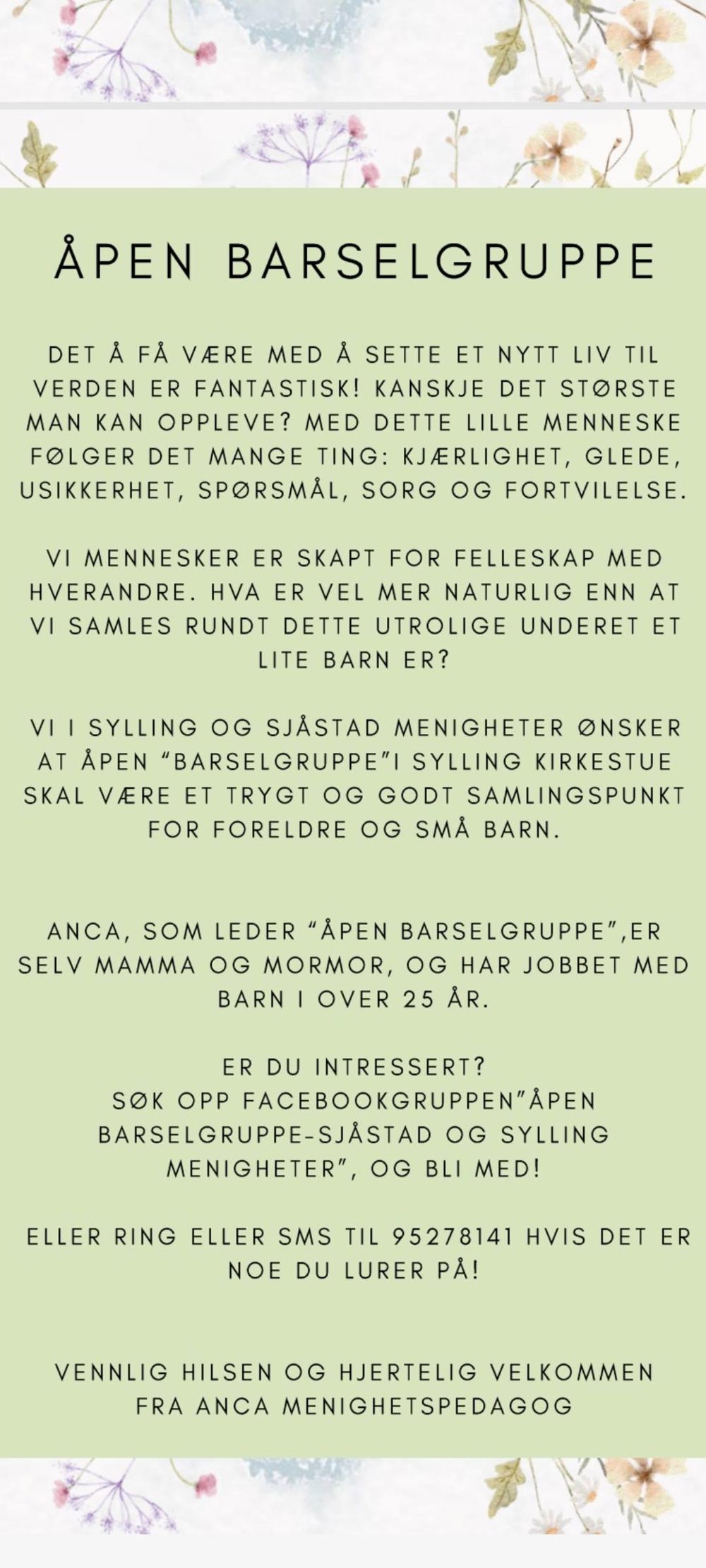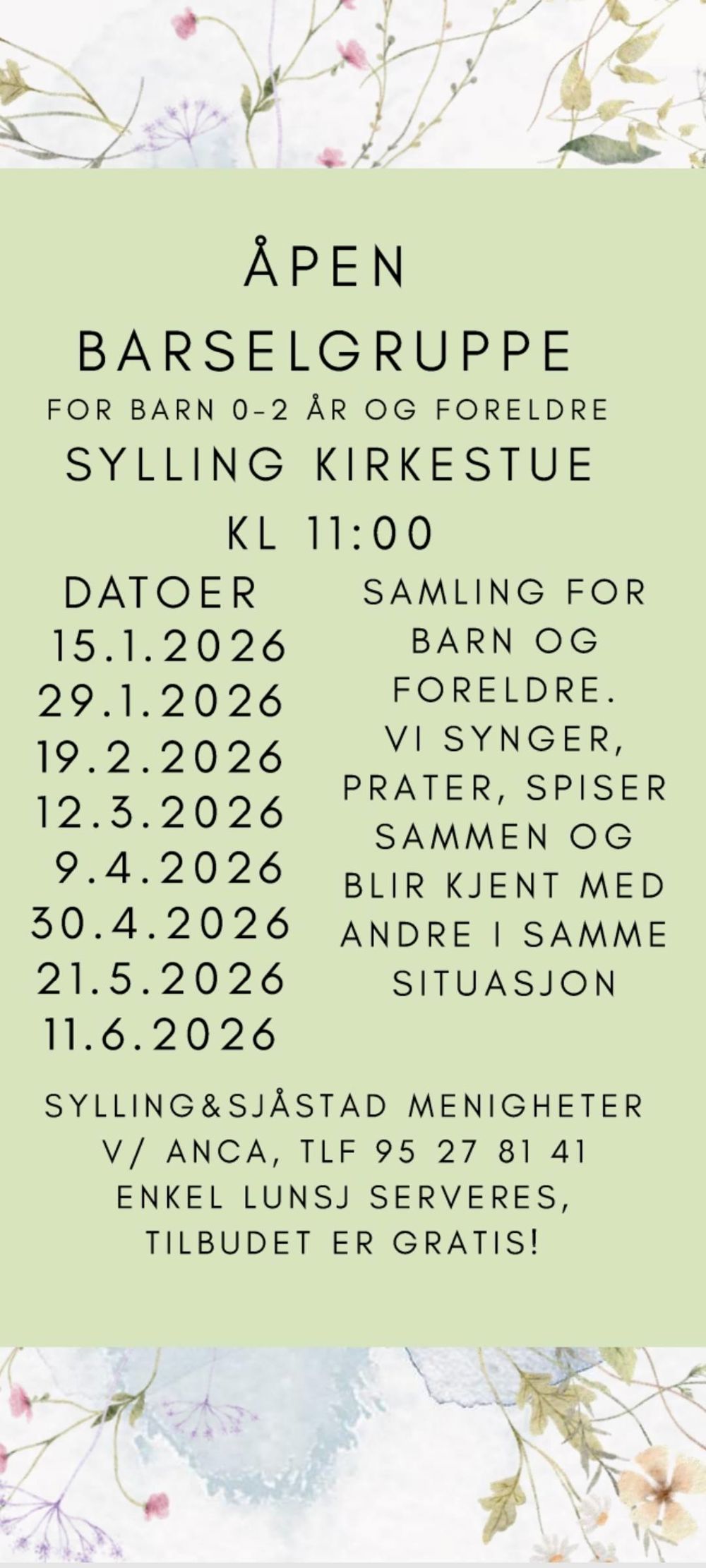 Åpen barselgruppe er en hyggestund for barn og foreldre, tilpasset barn og foreldre frem til ca 1 år.