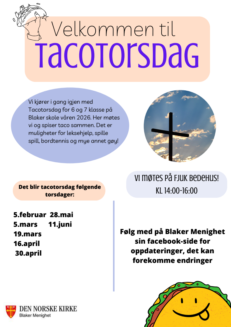 Vi kjører i gang med Tacotorsdag våren 2026 for 6 og 7 klasse som går på Blaker skole.