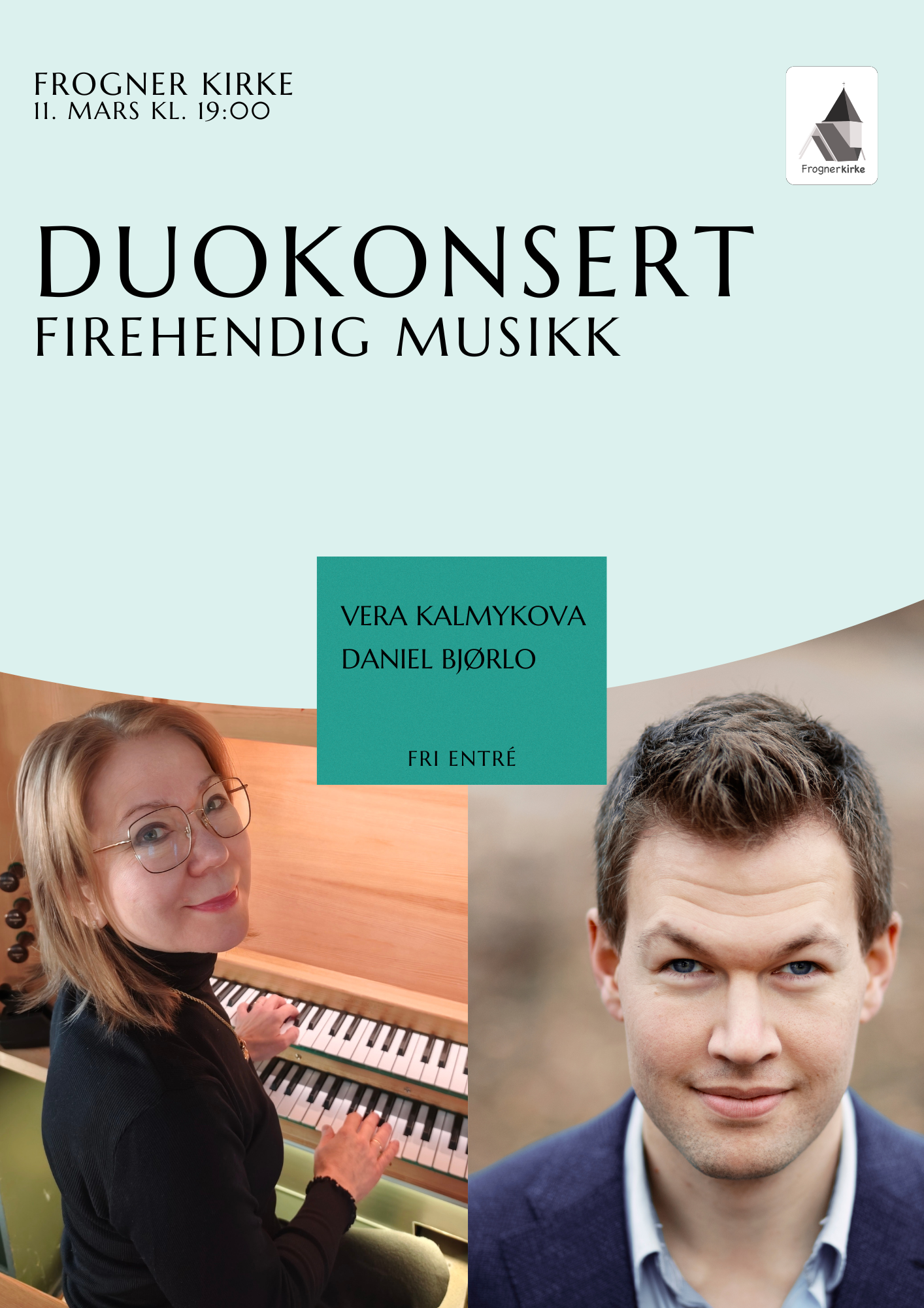 Frogners egne organister, Vera Kalmykova og Daniel Bjørlo, inviterer til firehendig konsert i Frogner kirke. Denne kvelden tar de i bruk begge kirkens instrumenter og byr på et stemningsfullt og variert program med noe av den vakreste musikken som er skrevet for fire hender og føtter. Publikum får oppleve både samspill og klangrikdom, der organistene utforsker instrumentenes fulle uttrykksregister. Blant høydepunktene står Franz Schuberts tidløst vakre Fantasi i f-moll, et verk fylt av både inderlighet og dramatikk. Konserten lover en musikalsk opplevelse preget av nærhet, virtuositet og stor kunstnerisk dybde.