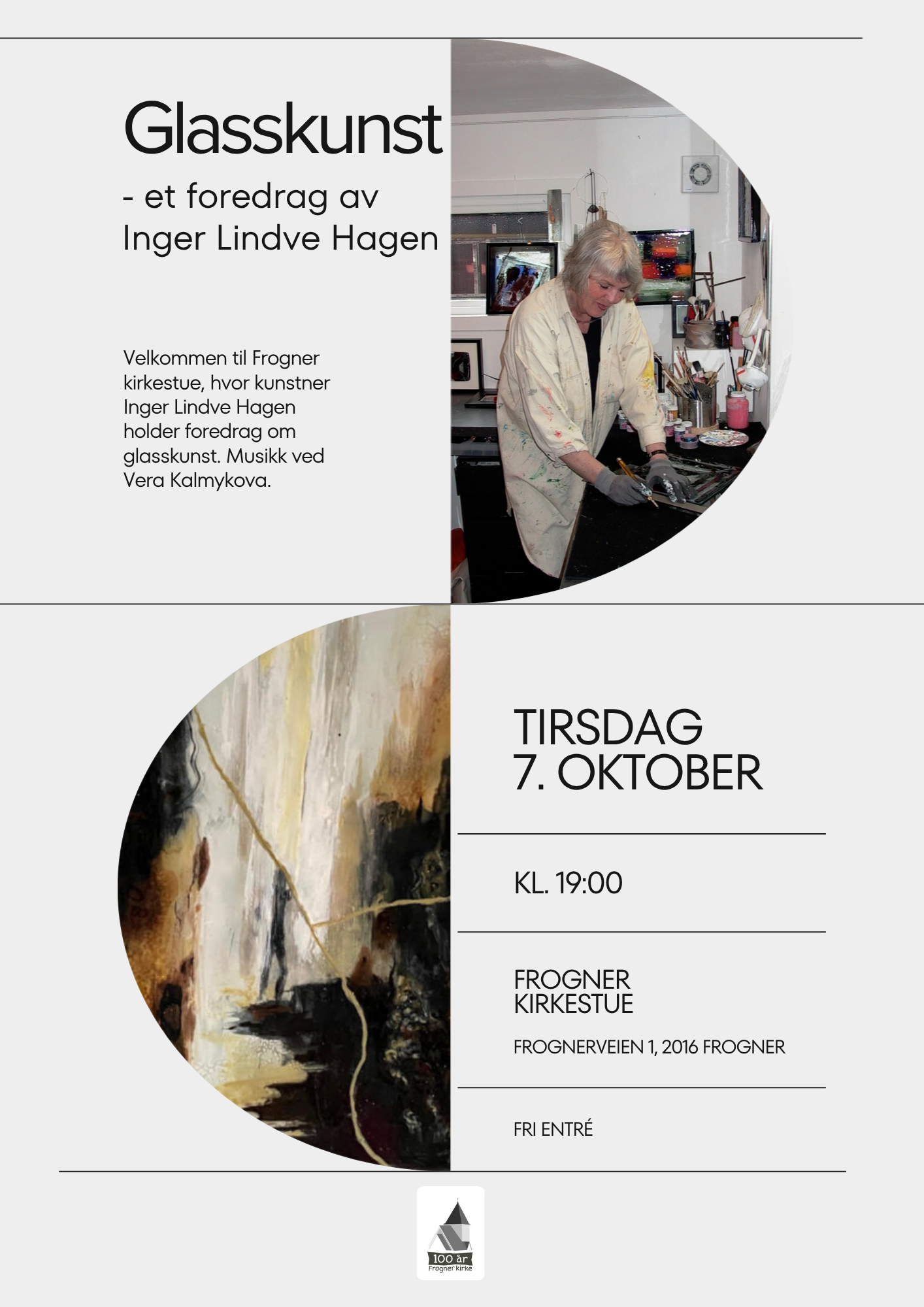 Tirsdag 7. oktober kl. 19:00 holder kunstner Inger Lindve Hagen foredrag om glasskunst. Det blir musikk ved Vera Kalmykova.