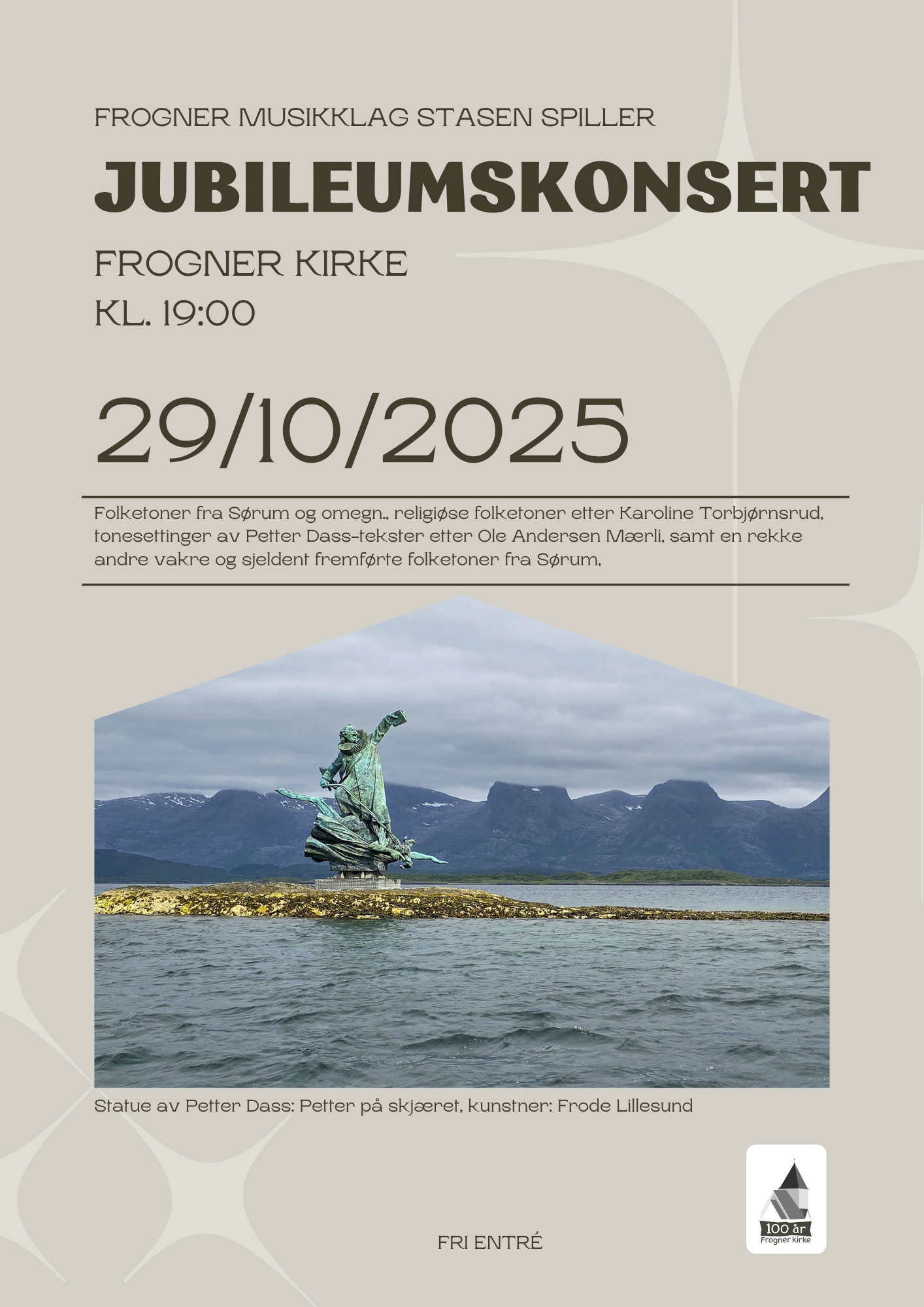 Frogner musikklag Stasen er et lokalt musikkorps med rundt 20 dedikerte musikanter, under ledelse av dirigent Magnar Osland. Gjennom denne konserten formidles en unik musikalsk arv som har levd i lokalsamfunnet gjennom generasjoner - et møte mellom lokal historie, nasjonal tonekunst og levende samtid.