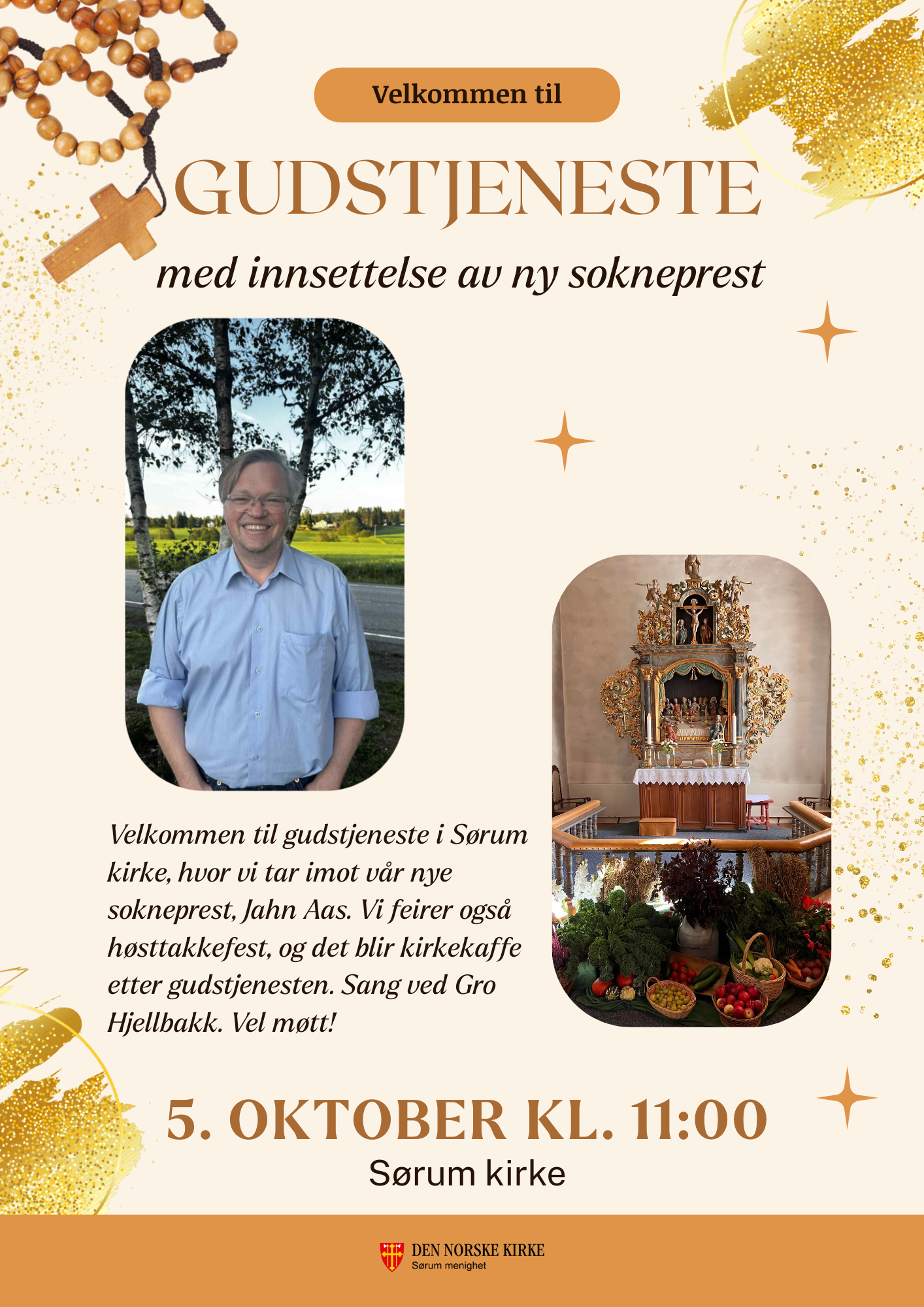 Velkommen til gudstjeneste i Sørum kirke søndag 5. oktober kl. 11:00 med innsettelse av vår nye sokneprest, Jahn Aas.