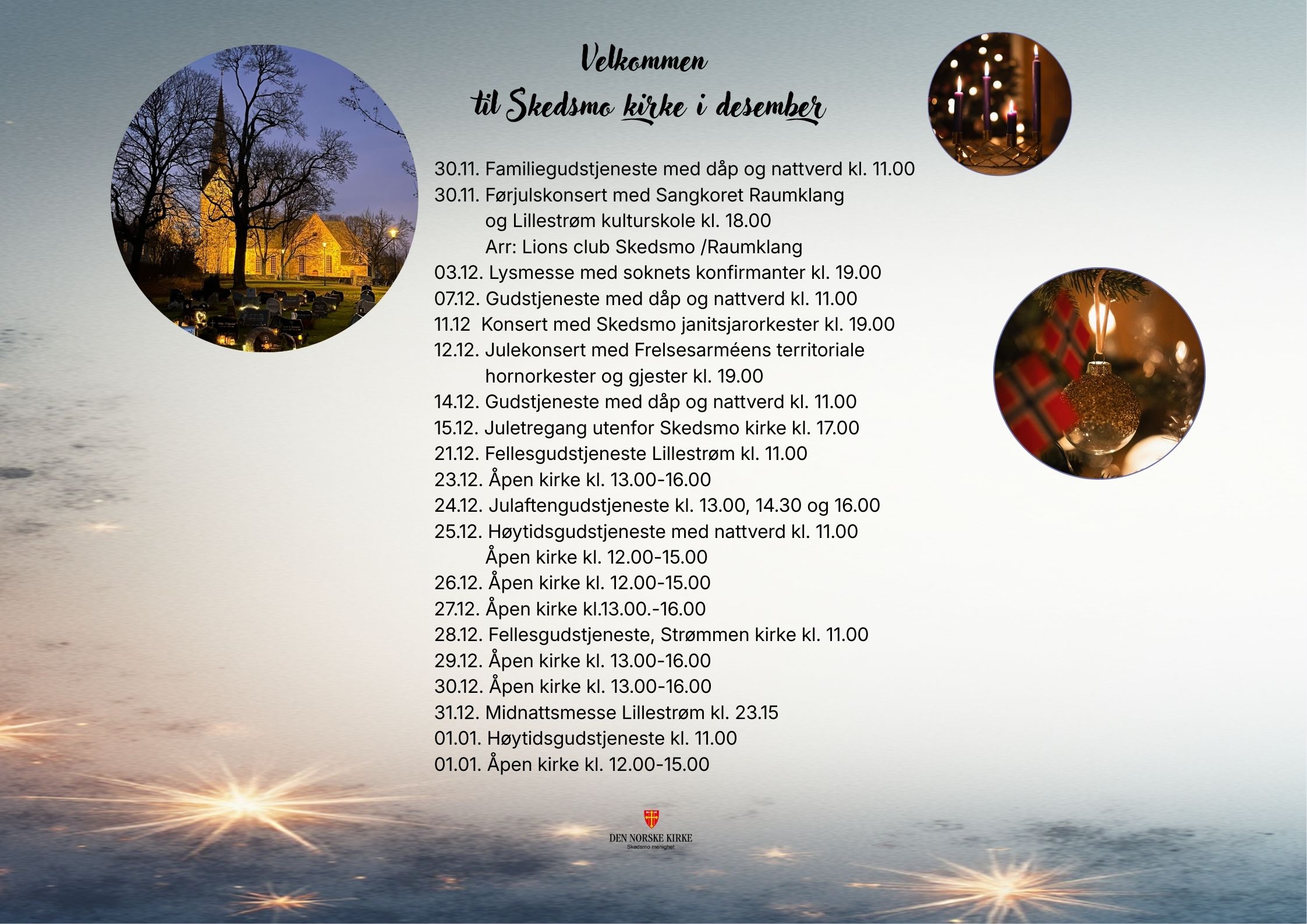 Advent og jul er trolig den tiden på året det er flest mennesker innom Skedsmo kirke. I år inviteres det inn til julekonserter, til arrangement for familier både i og utenfor kirkedørene, til åpen kirke i romjulen og ikke minst gudstjenester på julaften og helligdager. Her er det rom for deg!