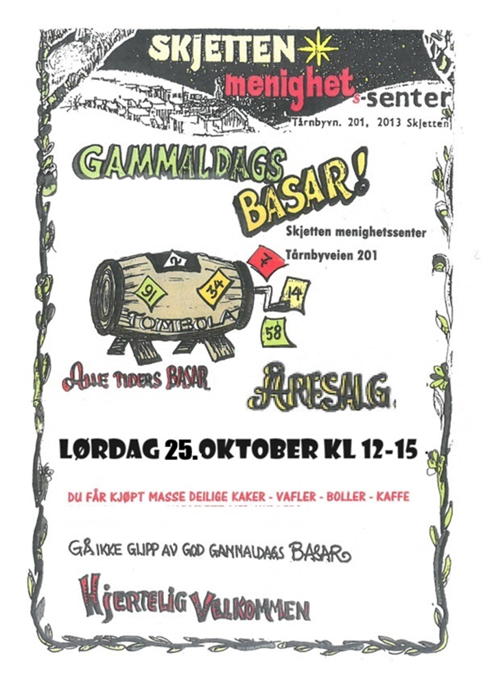 Velkommen til tradisjonell åresalgbasar på Skjetten menighetssenter lørdag 25. oktober kl. 12:00 - 15:00. Kafé med salg av kaker, kaffe, vafler og pølser. Åresalg med mange gevinster.