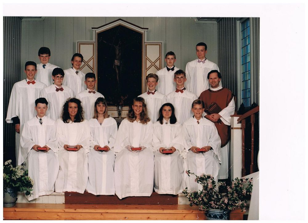 Midten f.v.: Prest Øystein Sjølie, Max Westlie Stadshaug, Lars Spernes, Emil Lund Pettersen, Ole Einar Bjerke Bakker, Mikkel André Heed Jensen, Sigurd Øverli.