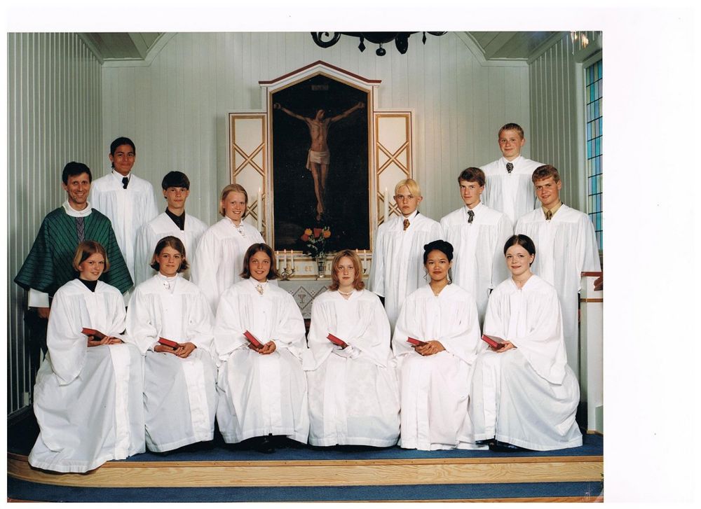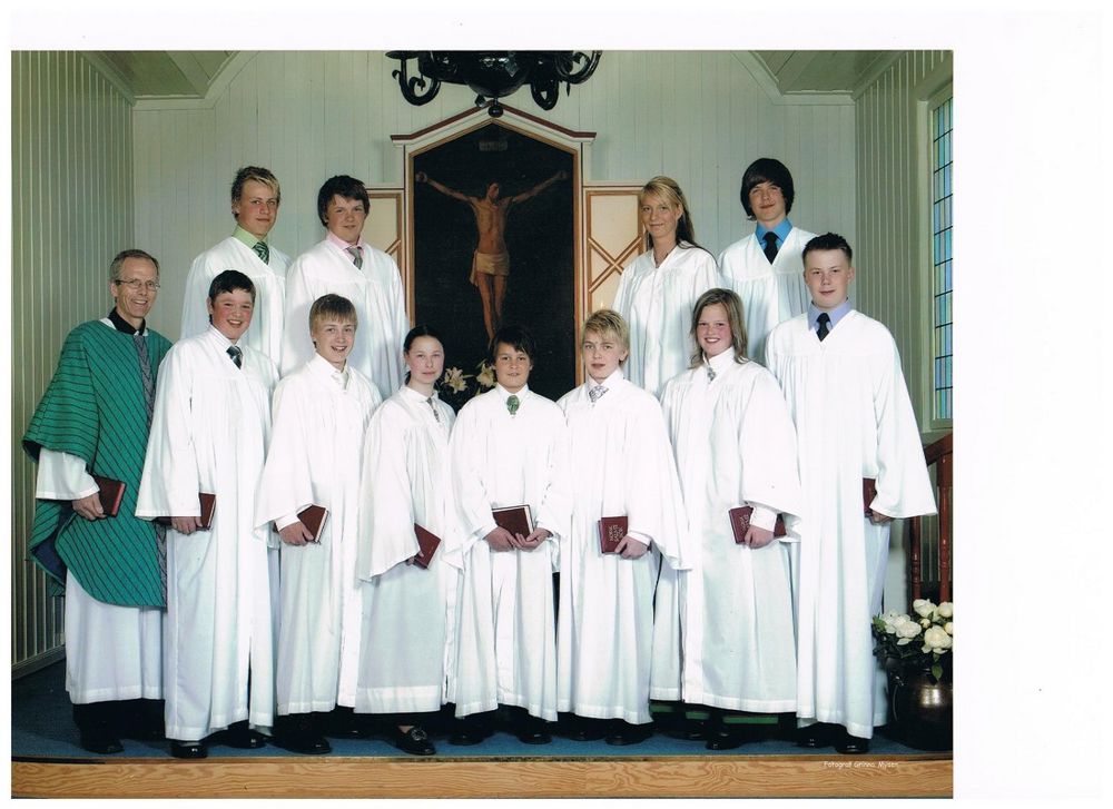 Midtre rekke f.v.: Ludvik Laurendz Jensen, Anna Vaaler Thorvaldsen, Rikke Heed Tangen, Marcus Lintho Orderud, Håkon Svingen Gunneng, Julie Lovise Christensen, Ole Thomas Funderud Sælen, Tuva Tatiana Jensen Bratbakken, prest Øystein Sjølie.