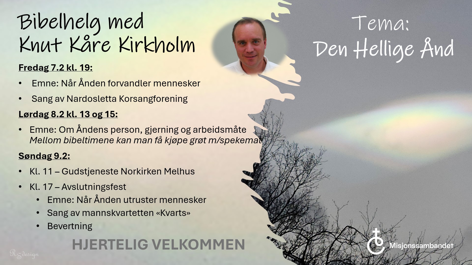 10.1.2025Knut Kåre Kirkholm underviser denne helga. På lørdag kan du spise middag på bedehuset.