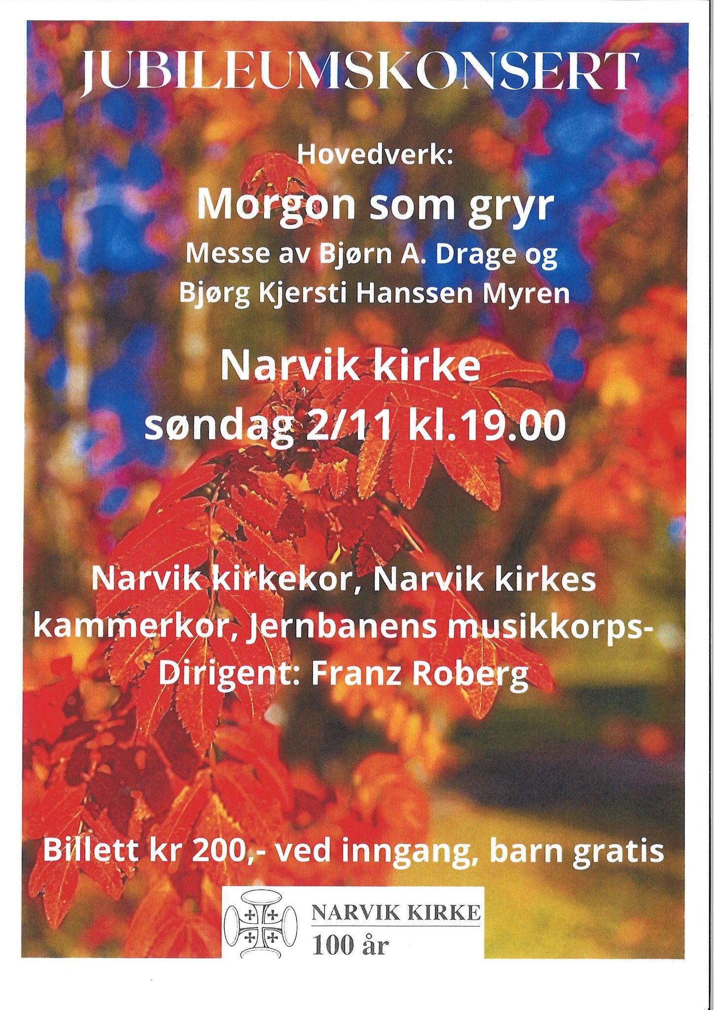 Hovedverket som oppføres denne kvelden er messen "Morgon som gryr" som Narvik kirkekor bestilte av Bjørg Kjersti Hanssen Myren (tekst) og Bjørn Andor Drage (musikk) i 2007 i forbindelse med korets og Jernbanemusikkens felles 100-årsjubileum i 2007. Verket ble uroppført høsten 2007 og har ikke vært oppført etterpå. Det er derfor på høy tid at det kommer fram i lyset igjen, og kirkens 100-årsjubileum er en naturlig anledning til det.