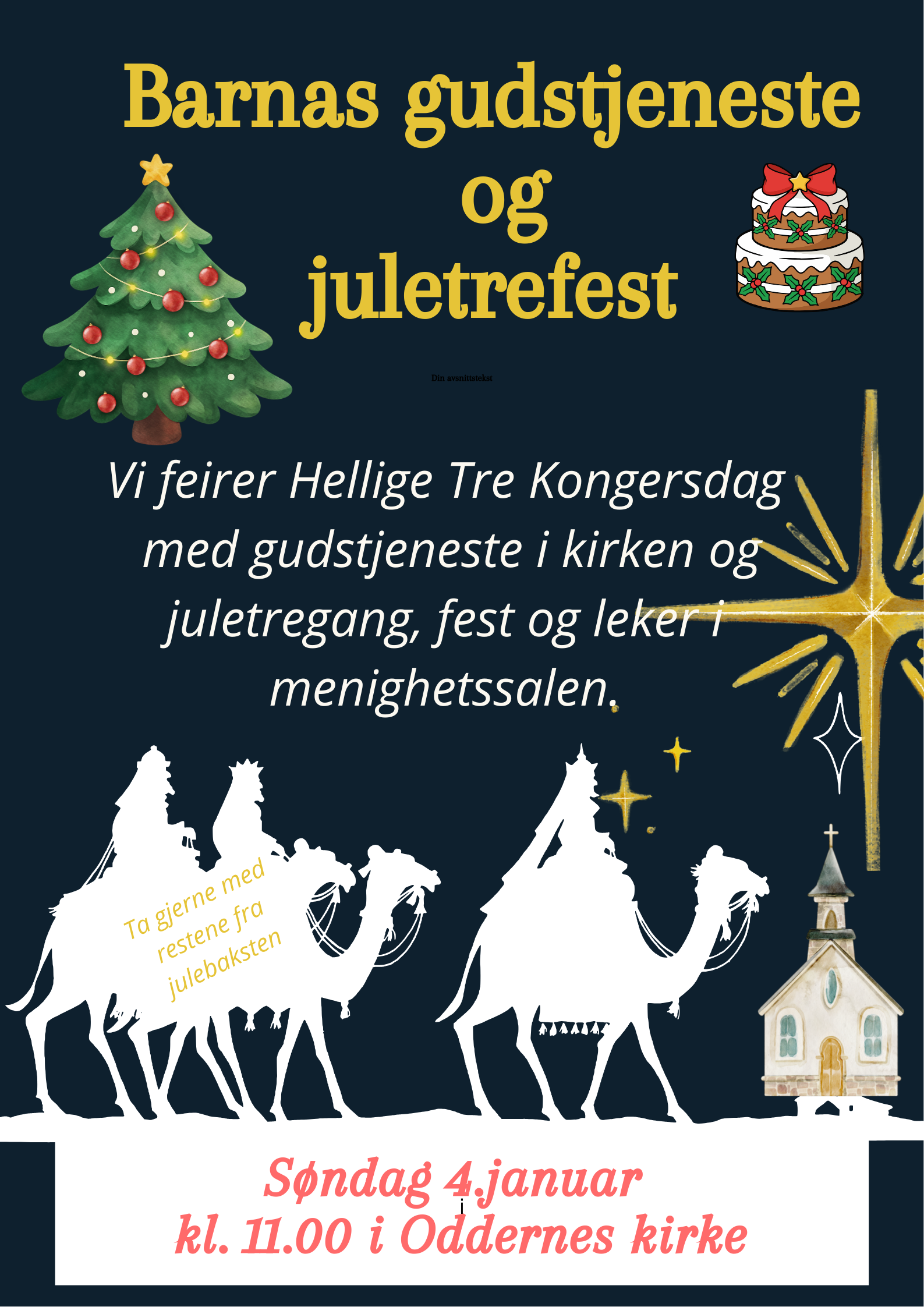 Store, små, unge og gamle er velkommen til Barnas Gudstjeneste i Oddernes kirke søndag 4. januar kl. 11.00. Gudstjenesten blir ved sokneprest Torill Farstad Dahl, menighetspedagog Silje Margrethe B. Eng og kantor June Barøy Myhrstad. Dette blir en feiring av Hellige tre kongersdag, og etter gudstjenesten holder vi en skikkelig juletrefest i menighetshuset. Vi gleder oss. PS: Dersom du har julebakst igjen: Ta det gjerne med, så lager vi et felles festbord.
