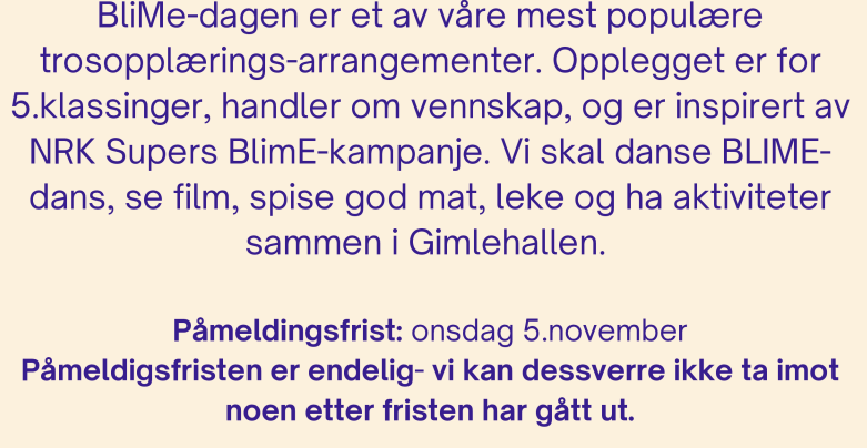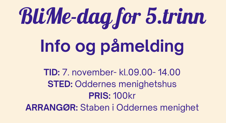 På skolens planleggingsdag fredag 7. november går den årlige Blime-dagen av stabelen i Oddernes menighetshus. Arrangementet er for barn som går i 5. klasse.