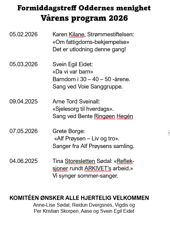 FORMIDDAGSTREFF er å være sammen, å kunne sitte ned med andre, få inspirerende ord, noe for tanken, noe for hjertet og musikk for øret og hjertet. Det er å be og synge sammen. Fremmøtet er ca. 70 personer. Vi håper Formiddags-treff er noe for deg!