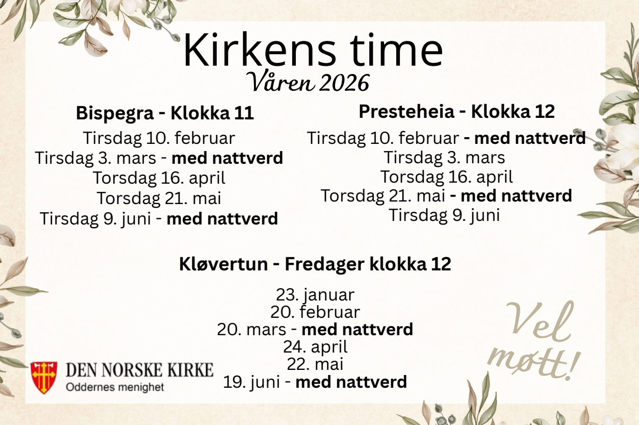Nedenfor seg du tidspunkene for Kirkens time på Kløvertun, Bispegra og Presteheia denne våren. Vel møtt.