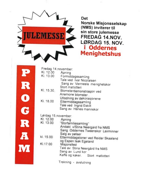 Den årlige julemessa til Det Norske Misjonsselskap går av stabelen 14. og 15. november i Oddernes menighetshus.