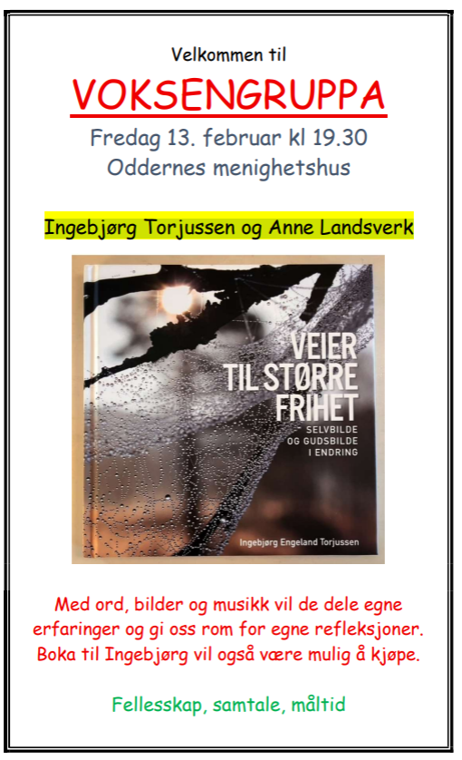 Neste samling for voksengruppa i blir fredag 13. februar kl. 19.30 i Oddernes menighetshus. Ingebjørg Torjussen og Anne Landsverk kommer og deler ord, bilder og musikk med oss.