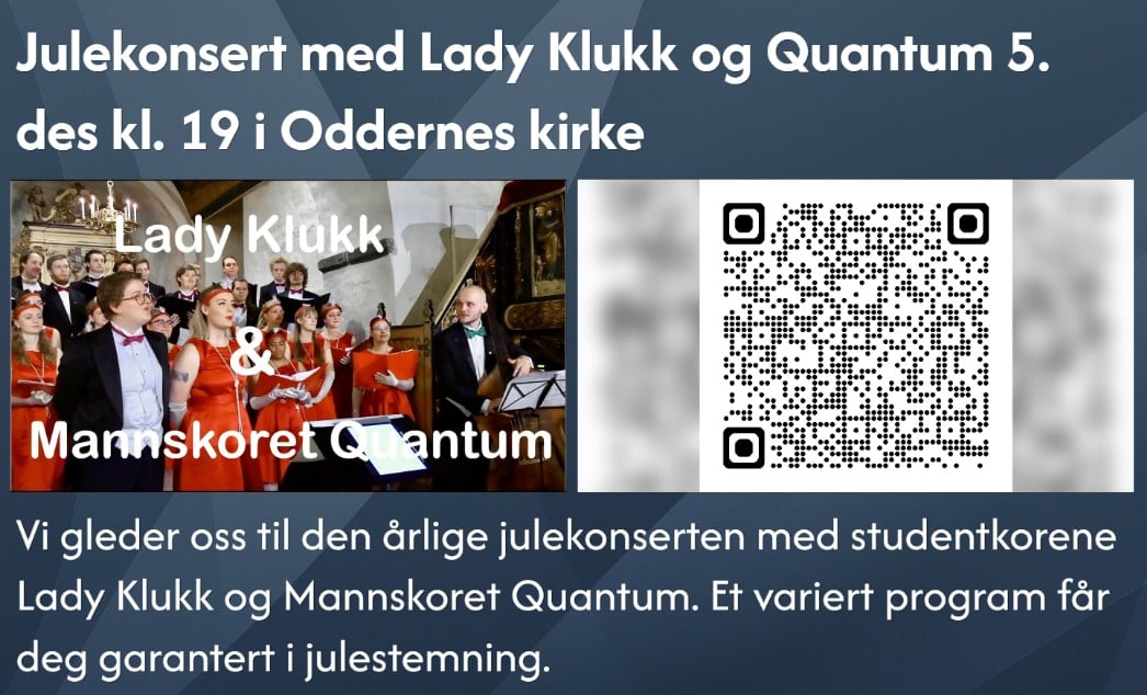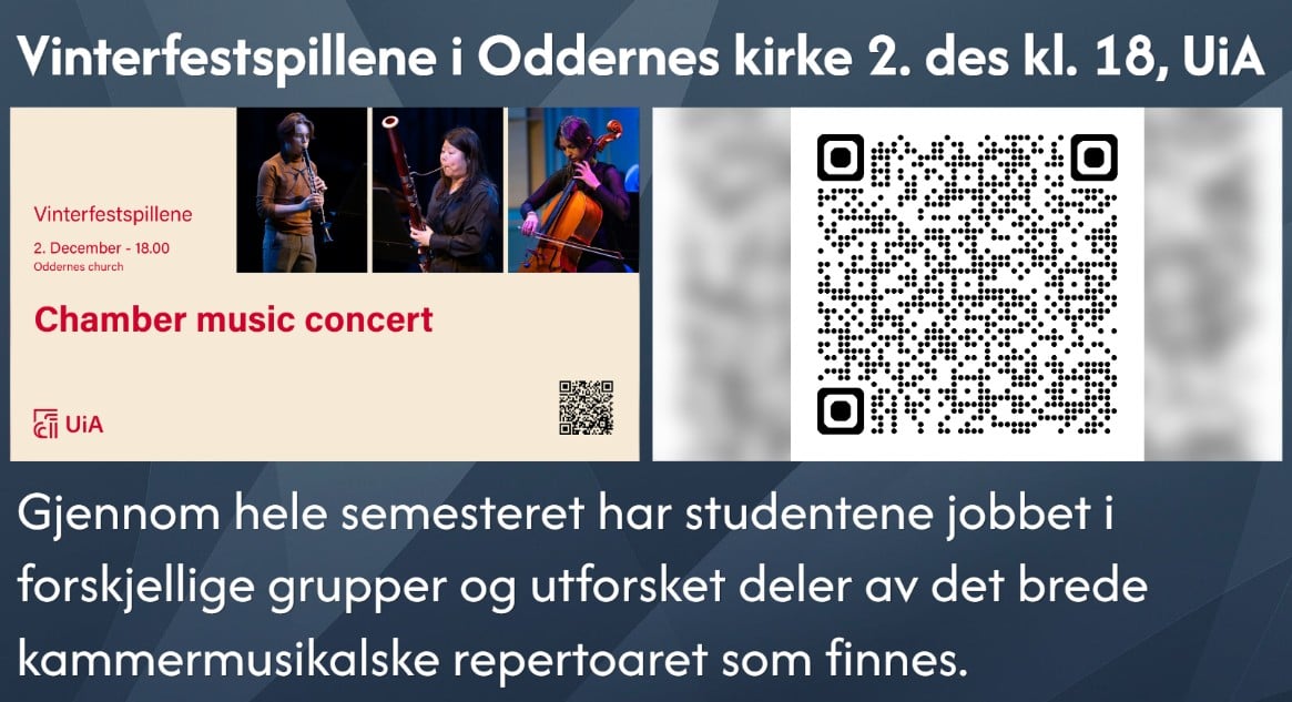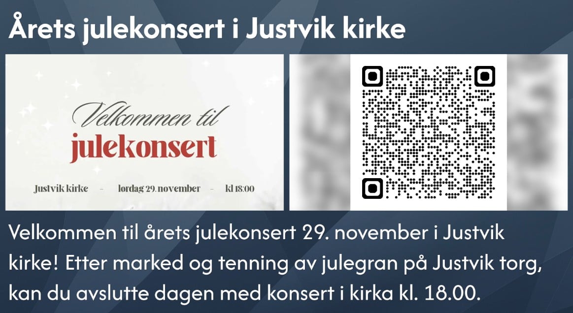 Velkommen til konsert i kirkene våre i førjulstiden! Les mer om konsertene via QR-koden eller under "Aktuelt" på nettsiden.
