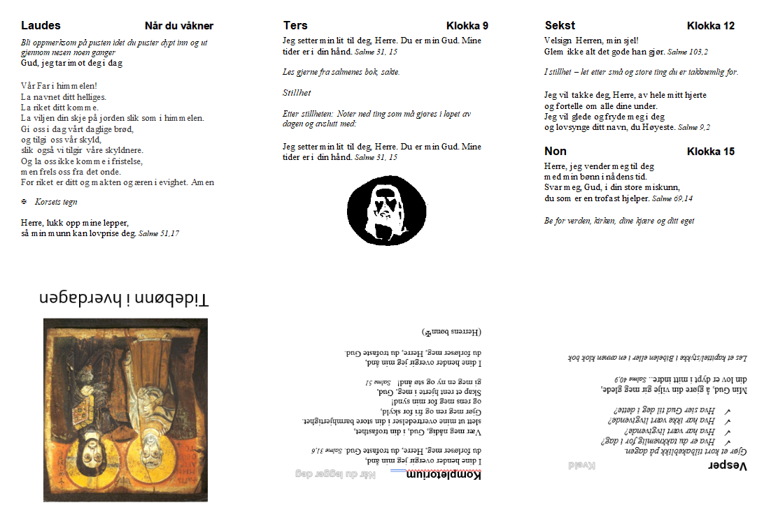 I fastetiden inviteres vi til å ta et grep eller gjøre en liten øvelse som minner oss om at vi er fastholdt. Domprost Nils Terje har laget en flott folder med tidebønner, som ligger vedlagt. Har du mulighet til å skrive den ut, bretter du arket på langs og deretter som et trekkspill, og du har en liten tidebønnslitturgi, som du kan legge i bibelen, eller lommen, eller på nattbordet, eller på kontorpulten. "Be som du kan og ikke som du ikke kan" sies det av åndelige veiledere. Denne tidebønnen kan du gjøre mer eller mindre omfattende, du kan be 1 gang eller 6 ganger, bruke 1-2 minutter eller litt lengre tid. Med dette skaper vi ""ørsmå hol i dagen", som Heidi Strand Harboe formulerer det i Norsk Salmebok 2013 nr.460