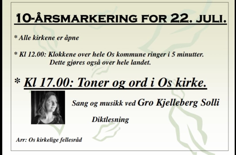 10.7.2021Kl 17.00: Toner og ord i Os kirke ved Gro Kjelleberg Solli. Diktlesning blir det også.