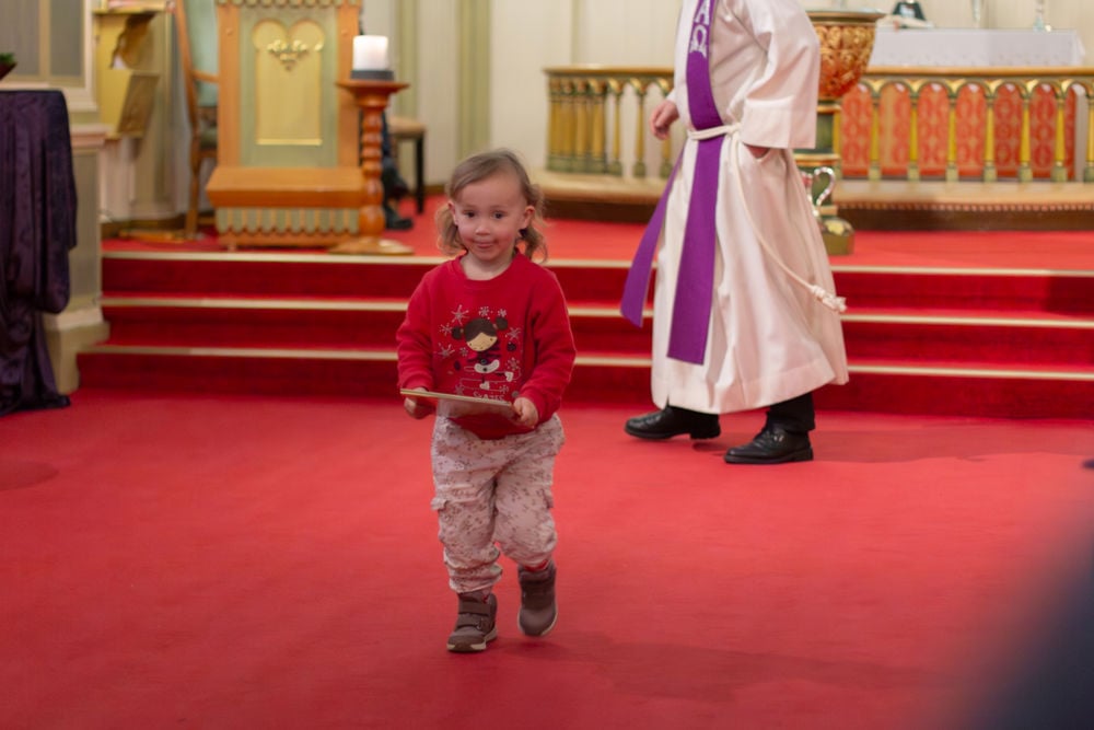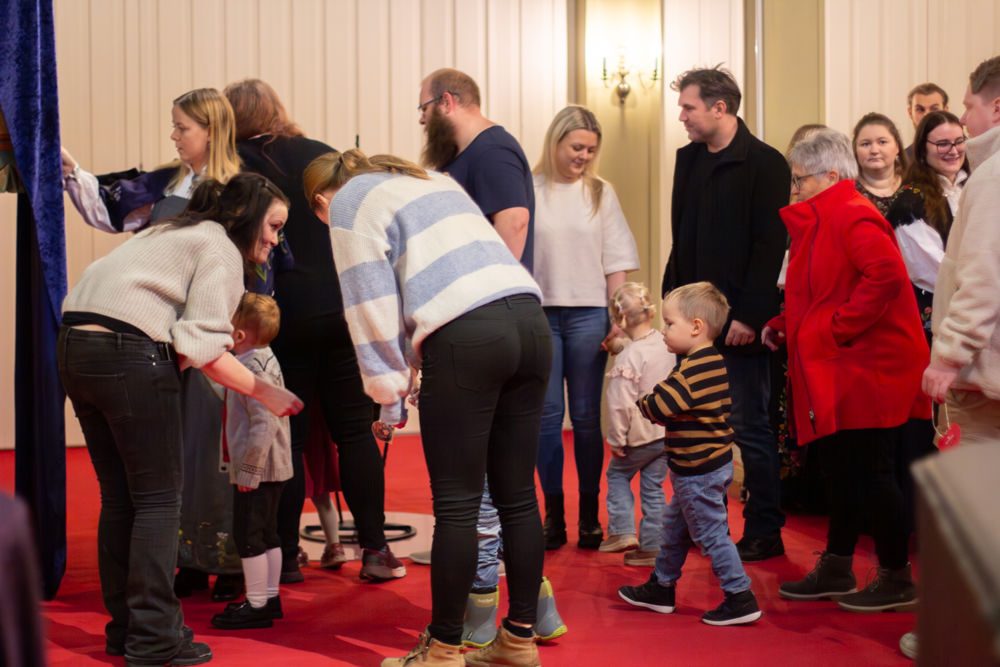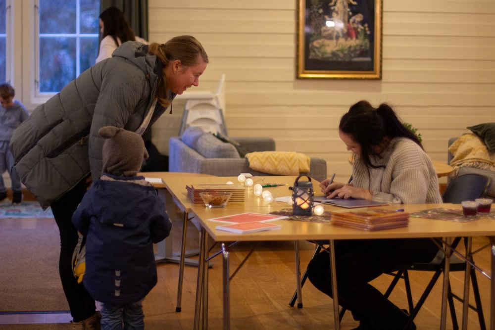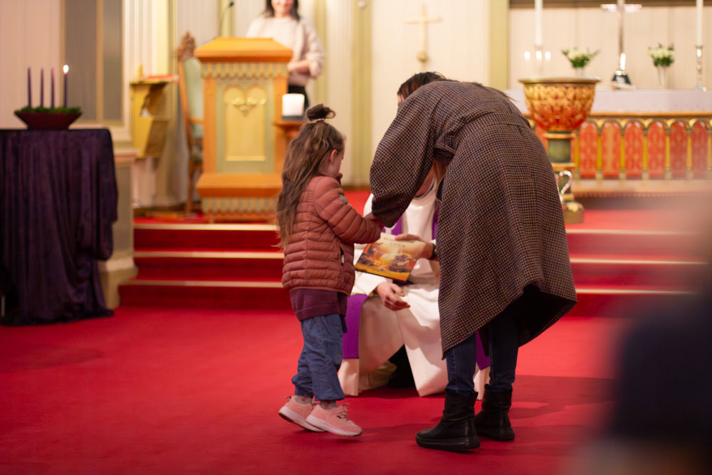 Under gudstenesta fekk alle treåringane komme fram til kyrkjelydspedagog Karianne og sokneprest Per, der fekk dei utdelt si eiga fine adventsbok. Nokre torde å komme fram åleine, medan andre kjende at dei trengde ei trygg hand å halde i. Under preika fortalde presten frå boka, om alle dyra som fekk kome i ly inne i ein stall, og om ei mor, ein far og ein liten baby som vart fødd i den same stallen. Barna kunne følgje med i bøkene sine medan presten fortalde.