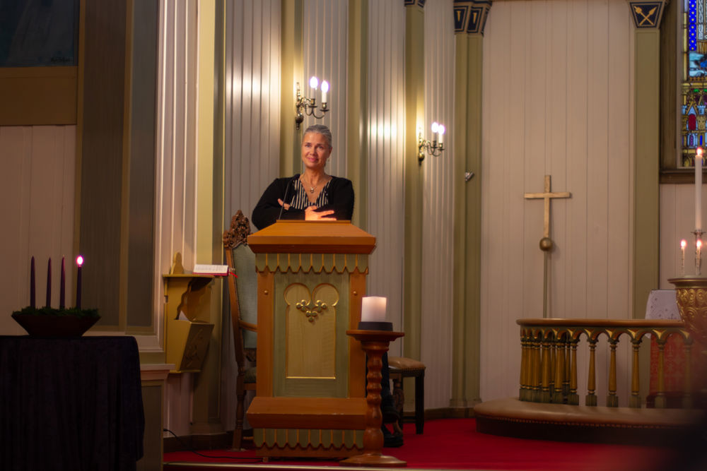 Det første lyset i adventsstaken vart tent av ein av årets konfirmantar. Konfirmantane bidrog òg aktivt i gudstenesta med lystenning og ved å styre tekst og bilete på veggen.