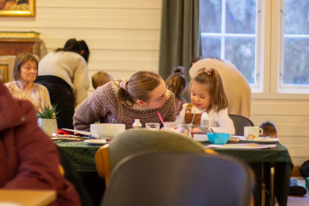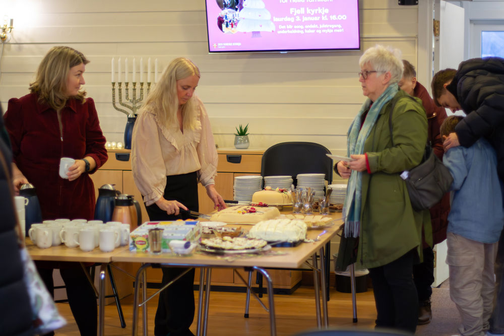 Etter gudstenesta vart alle ønskte velkomne til ei deilig kyrkjekaffi i den nyoppussa kyrkjelydssalen. Her stod eit bord fylt med mange ulike kaker, saft og kaffi. Treåringane og dei yngste barna fekk også velje mellom gele og sjokoladepudding, noko som vart ekstra stas. Det var òg sett opp ein hobbystasjon bakerst i salen, med glitter, teiknesaker, armbandsutstyr og klistremerke barna kunne lage ting med.
