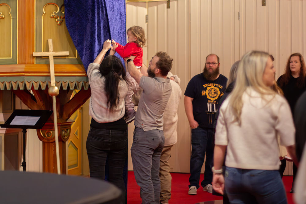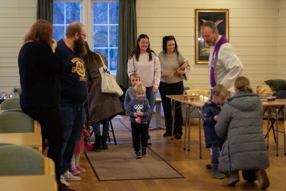 Før gudstenesta starta, fekk treåringane pynte eit eige hjarte med namn og klistremerke. Desse bar dei med seg inn i prosesjonen og hengde opp på ein flott blå velurduk som hang ned frå preikestolen.