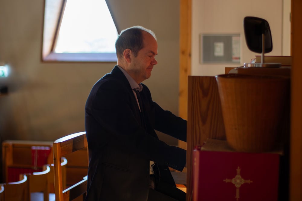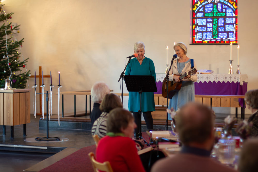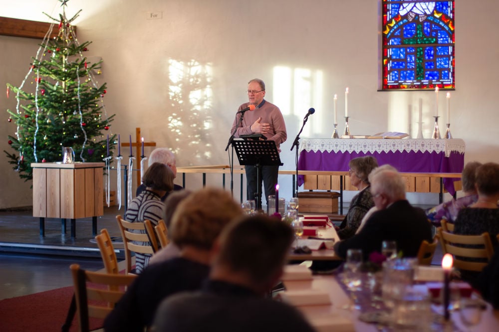 Kyrkja var pynta med langbord i adventens lilla, og stemninga var roleg og forventningsfull. Organist Øystein Steinsland som satt seg ved orgelet og spela kjende juletonar medan folk fann plassar ved borda. Dei fleste deltakarane hadde pynta seg for anledninga, og praten gjekk lett allereie før programmet starta.
