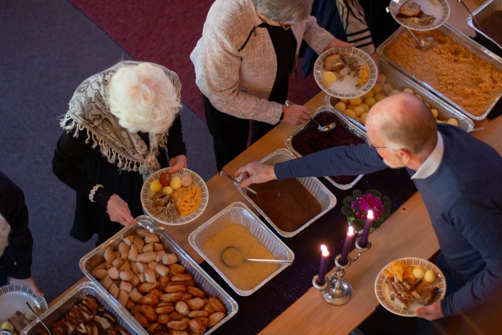 På menyen stod ein tradisjonell julemiddag med både pinnekjøt og ribbe. Den velluktande dampen frå serveringsfata fylte rommet og gav ein umiddelbar kjensle av jul. Det var rikeleg med mat, og mange forsynte seg både ein og to gonger.
