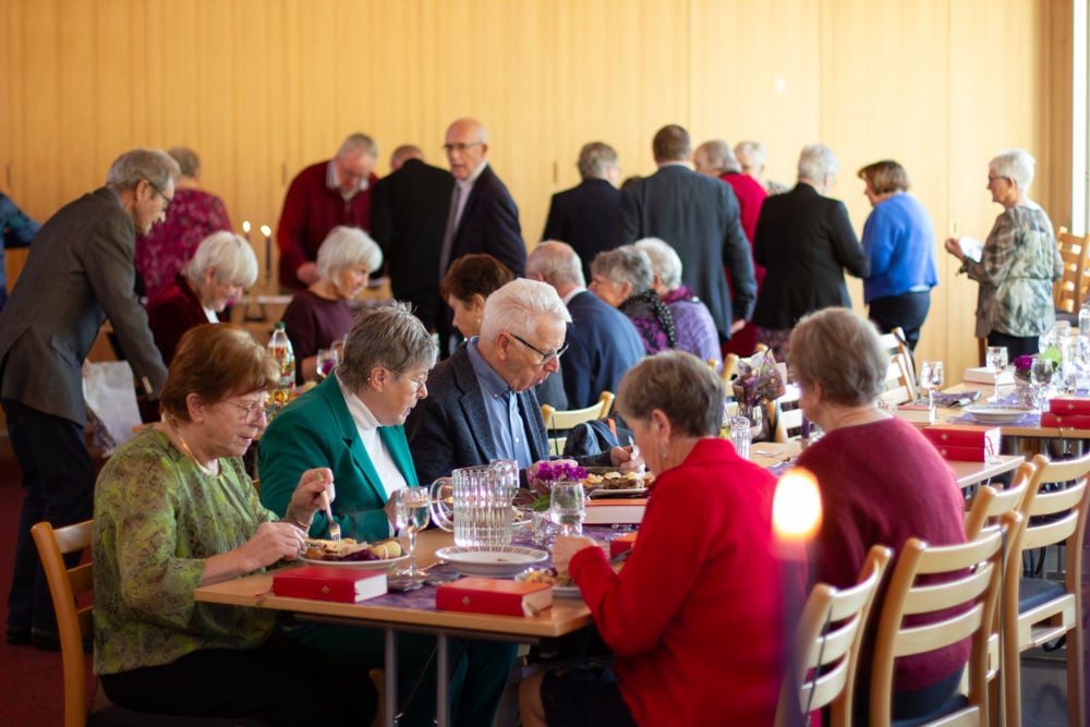 Mot slutten av dagen vart dessert servert: karamellfromasj, klementinar og kaffi. Deretter følgde ei uformell utlodning, der dei lilla blomane som stod på borda fungerte som premiar. Det vart både latter og spenning då vinnarlodda vart trekte.