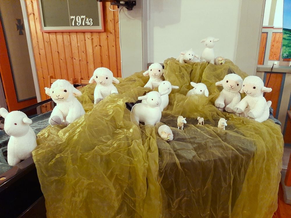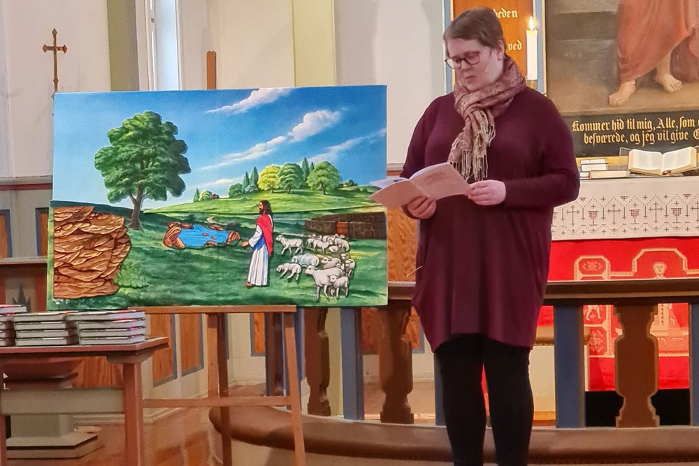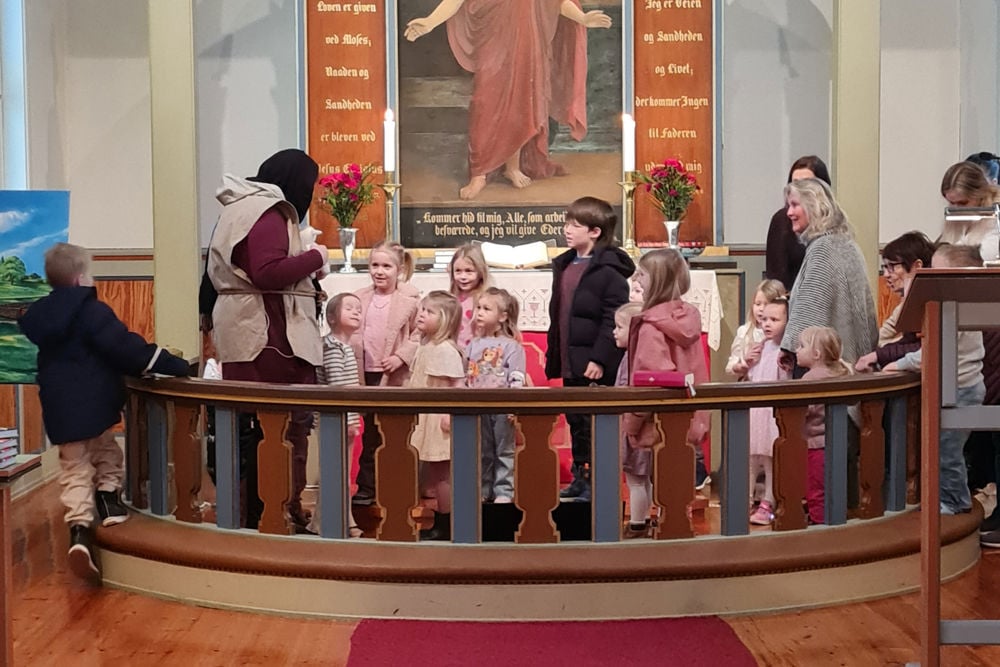 På gudstenesta fekk vi besøk av ein gjetar. Han hadde med seg heile saueflokken! Og då den eine sauen, Krølle, hadde rota seg bort, var alle med på å leite. Ei lang rekke av barn var på leiting gjennom heile kyrkja; under benkar, oppå preikestolen, nedi leikekroken og bak alteret. Heldigvis fant vi sauen til slutt! Han hadde gøymd seg under knelekrakken i alterringen.