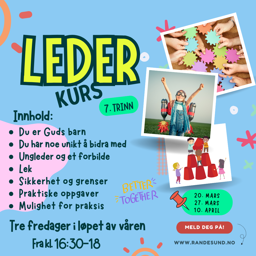 Et kurs for barn som ønsker å lære mer om å være ung leder. Vi snakker om at du er Guds barn, hva du kan bidra med, og hvordan du kan være en god leder og et forbilde. Vi lærer også om lek, sikkerhet og grenser, og prøver oss på praktiske oppgaver. Det vil også være mulighet for praksis senere på våren.