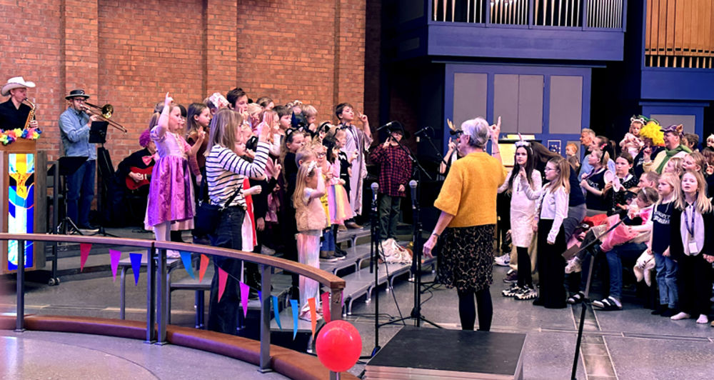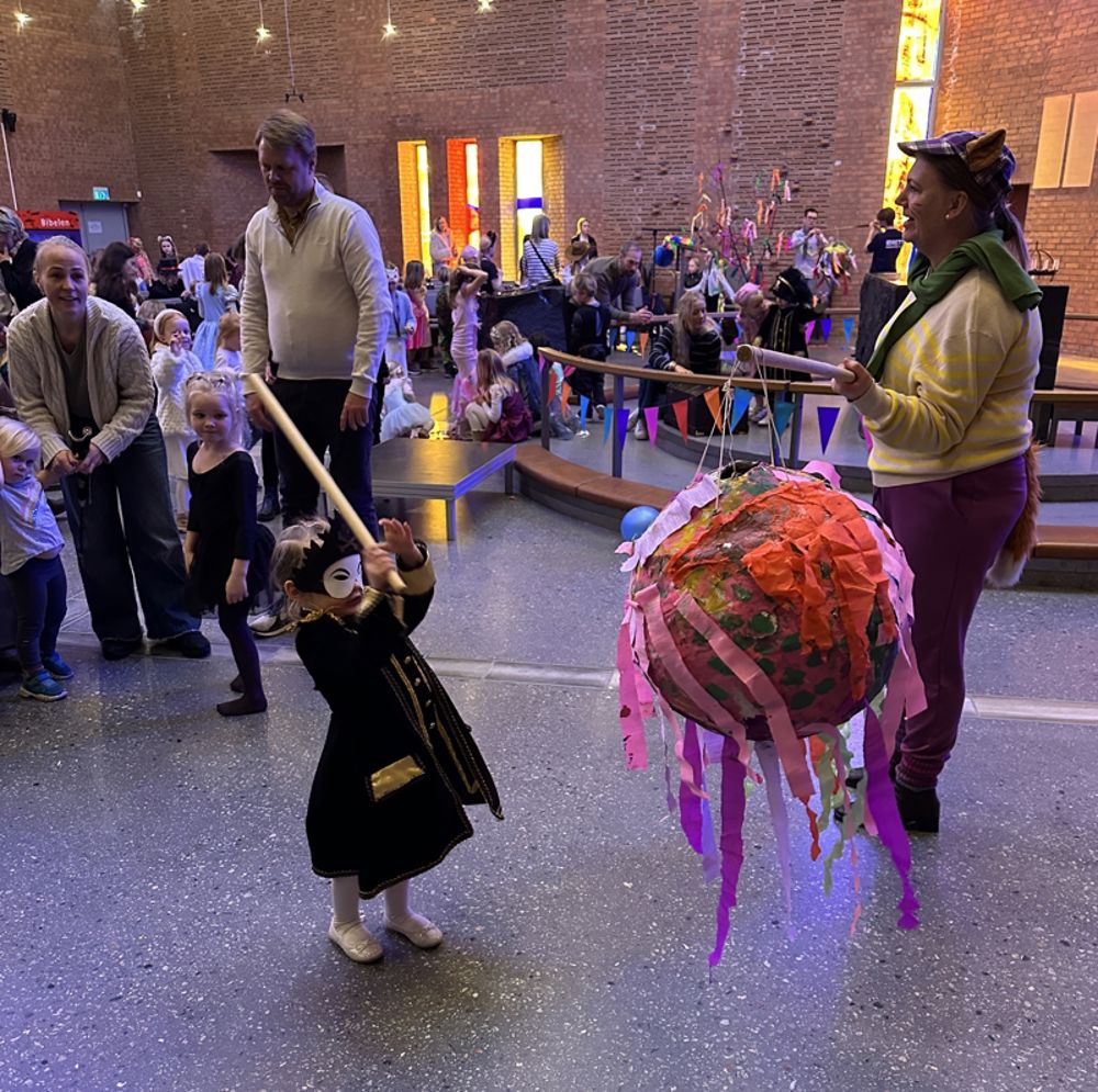 Det ble en festlig gudstjeneste med Kristin prest, Tros 1 og Rabakoret! Først var det gudstjeneste, så kirkekaffe med gelé, presentasjon av kostymer og pinjataer.