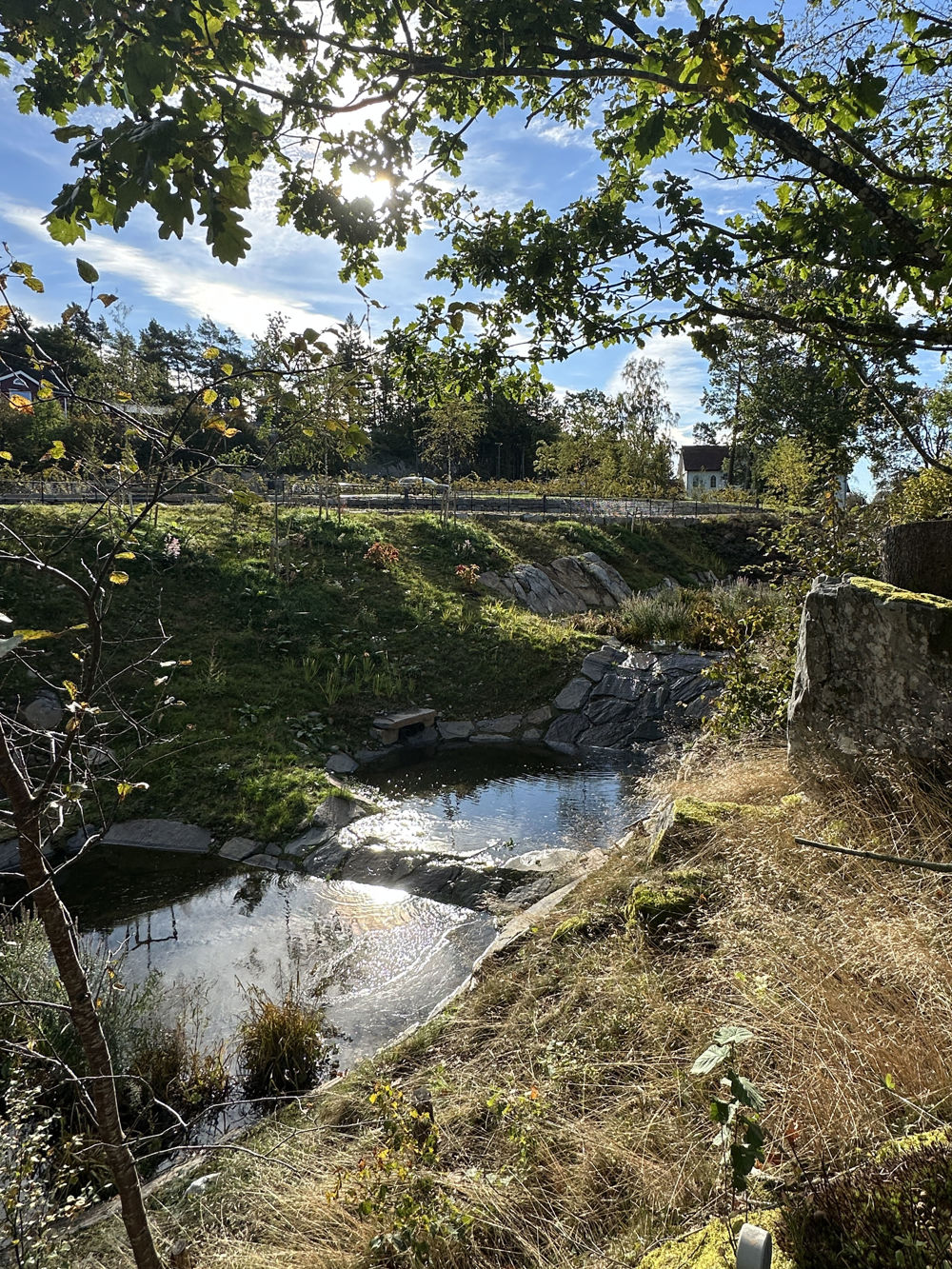 Det fineste stedet er kanskje minnelunden på høyden rett over Frikstadtjønna. Her blir det en plass med benker og med fin utsikt over vannet.