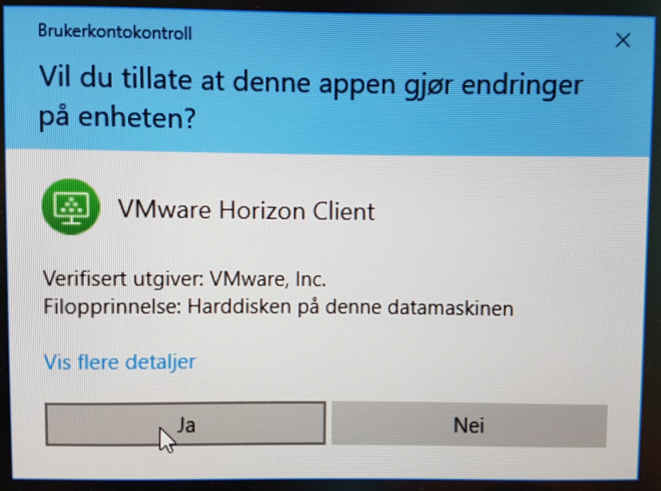Klikk «Ja» på denne meldingen for å tillate at VMware Horizon Client kan gjøre