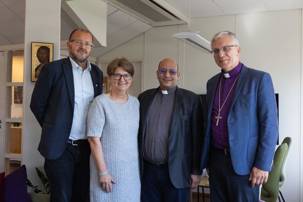 Imad Haddad har vore på besøk i Noreg fleire gonger. Sist i september 2025. Frå venstre: Einar Tjelle (generalsekretær i Mellomkyrkjeleg råd), Berit Hagen Agøy, Imad Haddad og preses Olav Fykse Tveit.