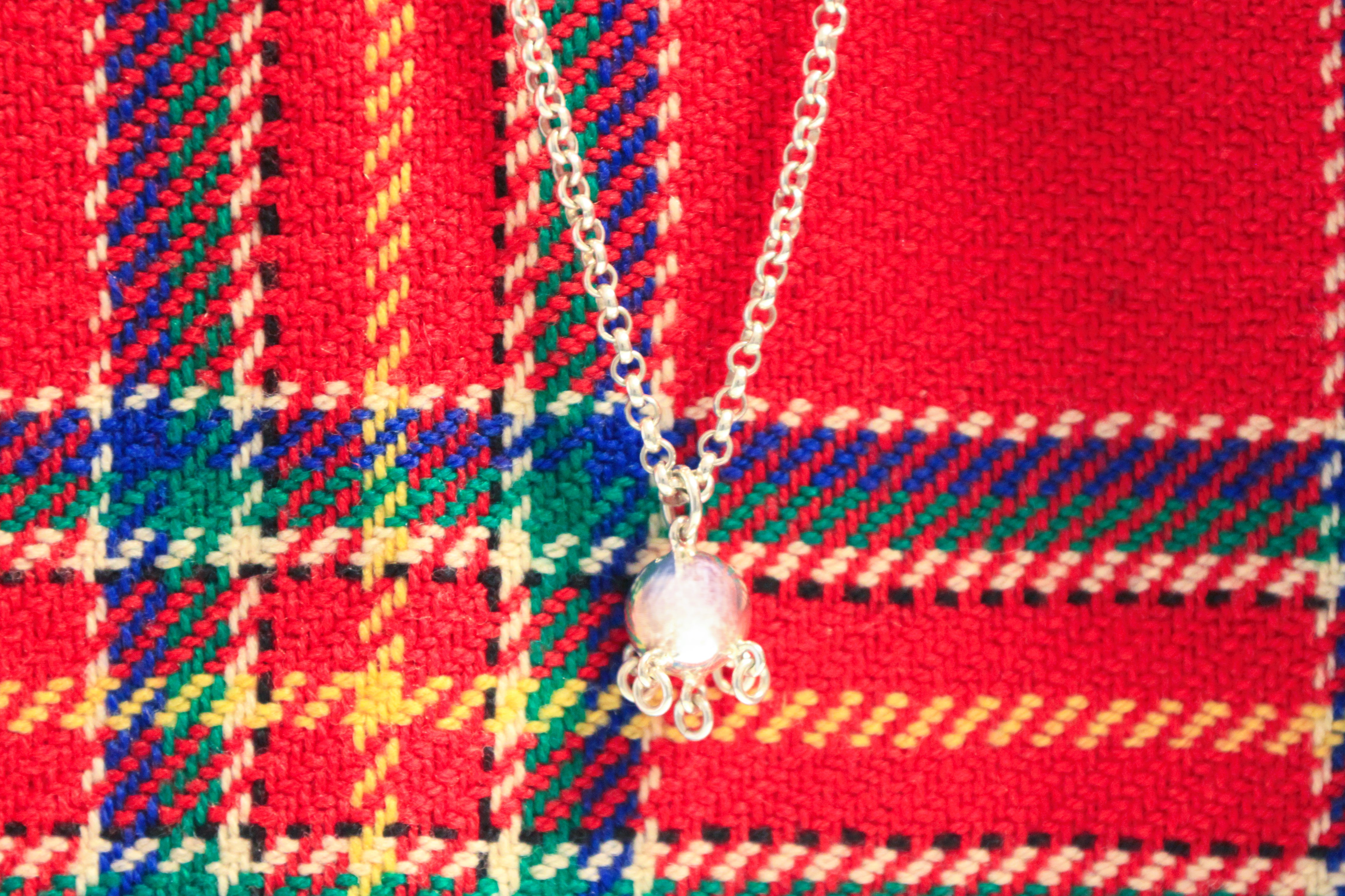 Komsekule oppå samisk sjal. Komsekule er et tradisjonelt samisk sølsmykke. Fra gammelt av hang man den på komsa hvor barnet lå, som en beskyttelse.