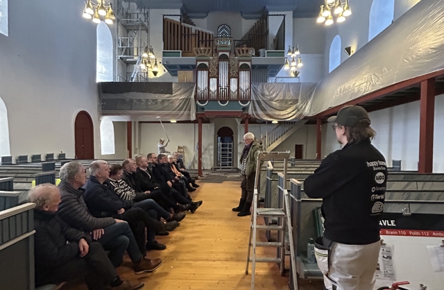 Lokalhistoriker Olaf Nøkleby fortalte om restaureringsarbeidene i Hoff kirke. Foto: Rannveig Theisen.